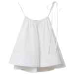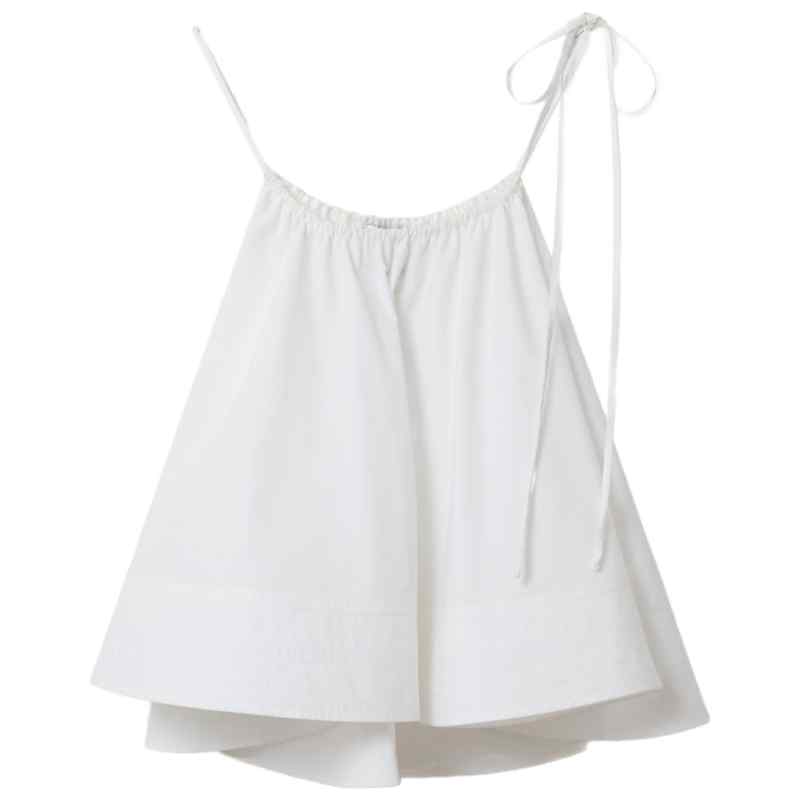 Pure white, sleeveless silhouette, sculptural ruffle detail, construction in cool poplin, organic cotton Cotton ruffled top.