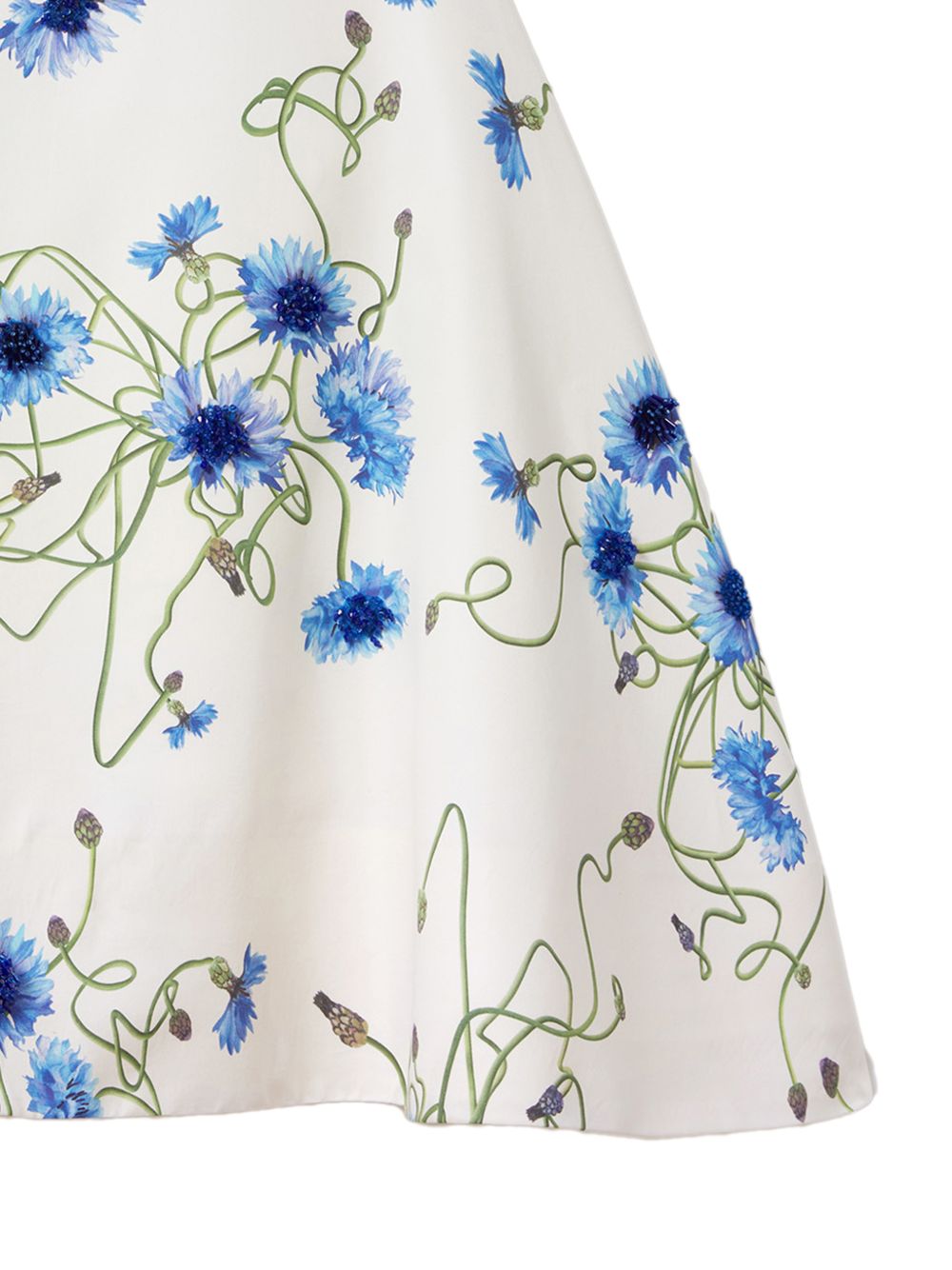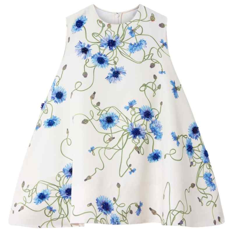 Cornflower print, organic cotton fabric with embroidered floral detailing, structured a-line silhouette, sleeveless design, soft volume through the skirt, concealed fastening Embroidered a-line dress.