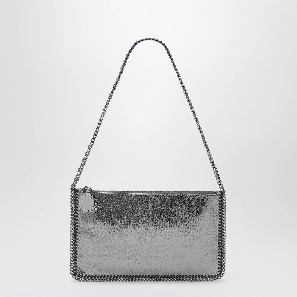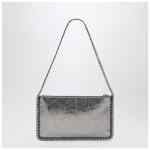 Metallic Grey Ruched Textured Clutch Shoulder Bag from Stella McCartney featuring a silver-tone chain shoulder strap, a zip fastening, a zip puller with an engraved logo medallion charm and a single compartment.