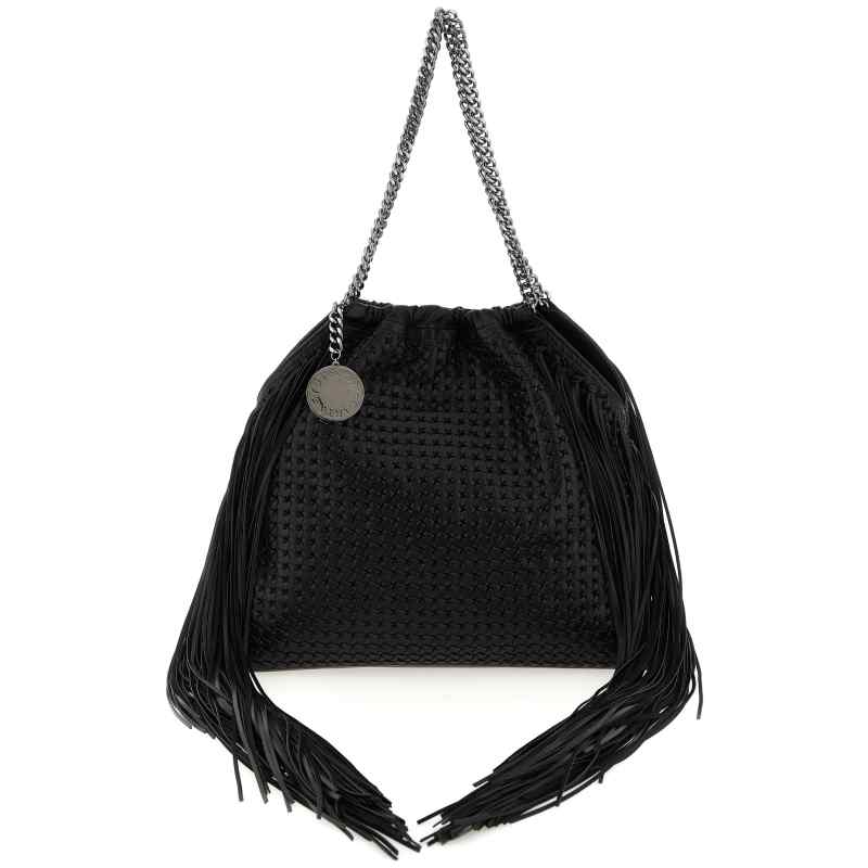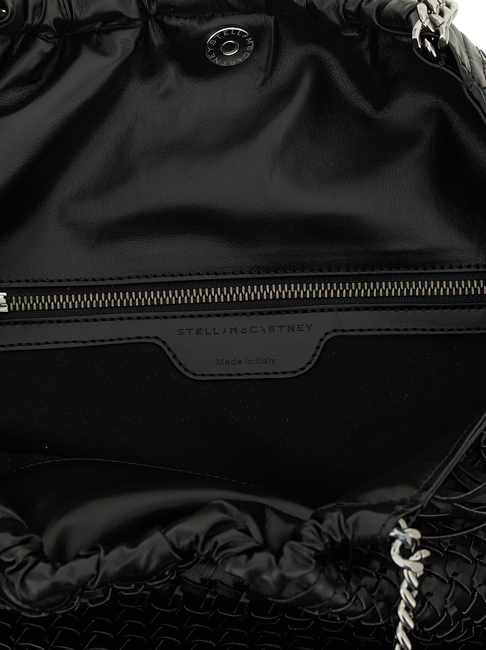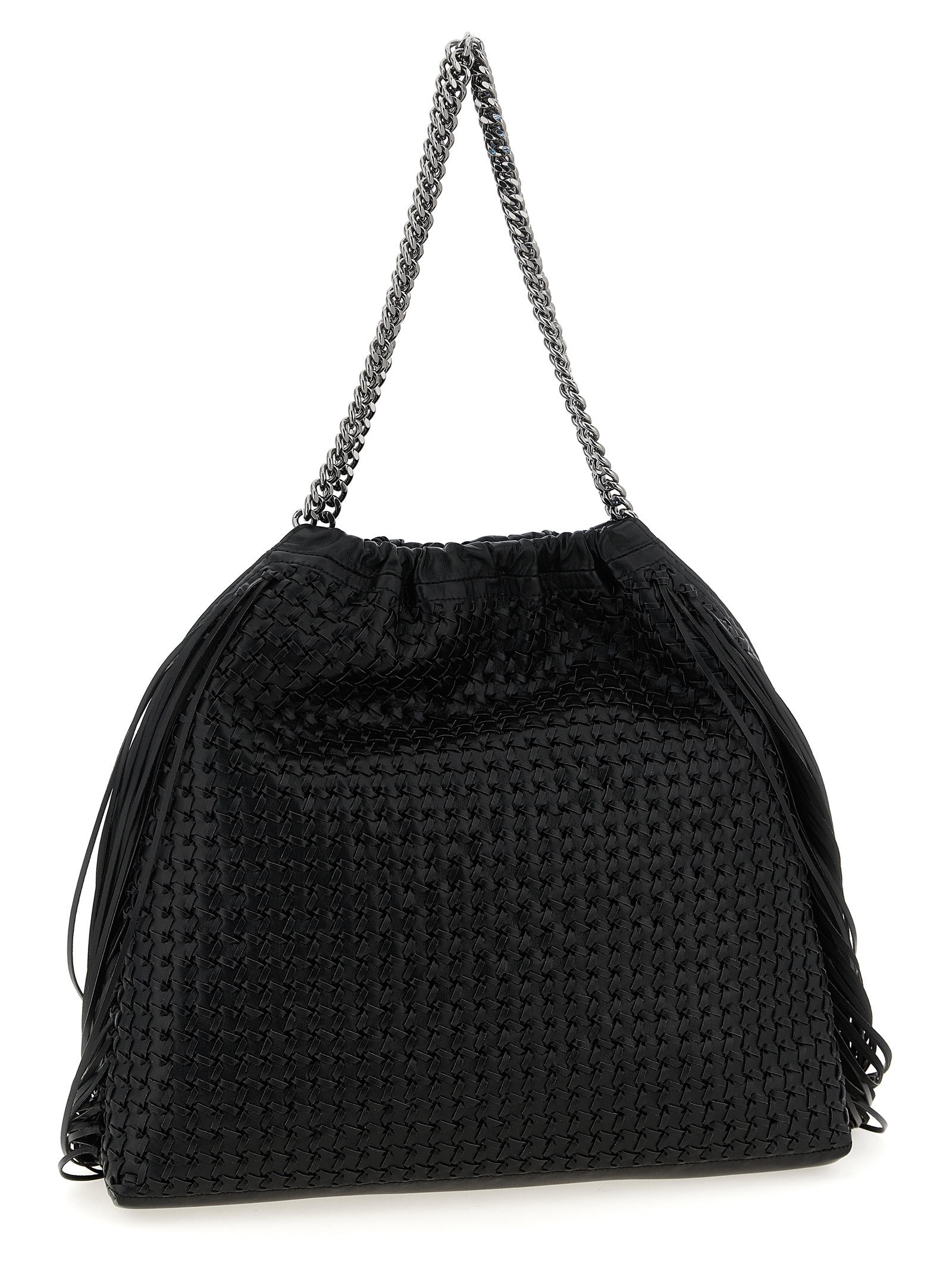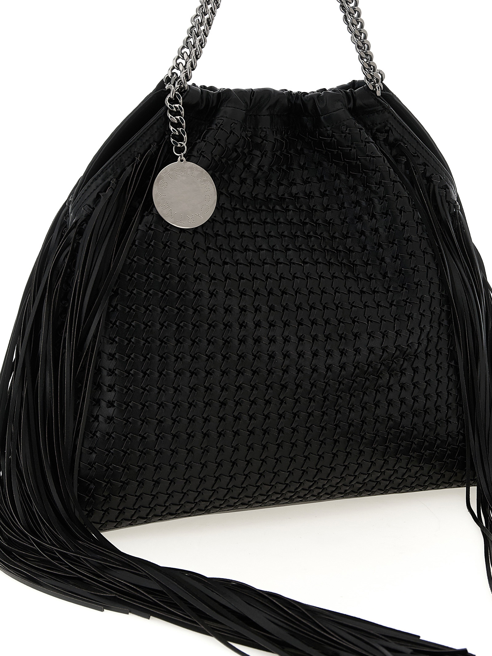 ‘falabella’ medium shoulder bag in woven leather-effect ‘woven vegan leather’ fabric, Side tone-on-tone fringes, Double fixed airlite stainless steel handle with diamond cut, Inner magnetic closure, Crinkled top, Medallion charm with engraved logo, Lining, One inner pocket.