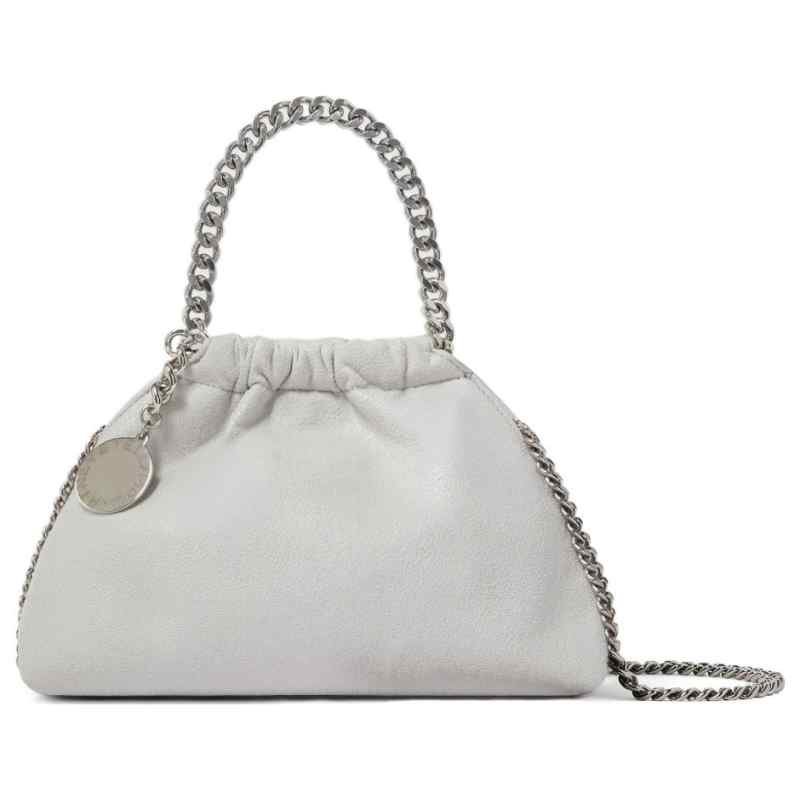 pearl grey logo detail chain strap This piece comes complete with a protective dust bag. Falabella Drawstring mini tote.
