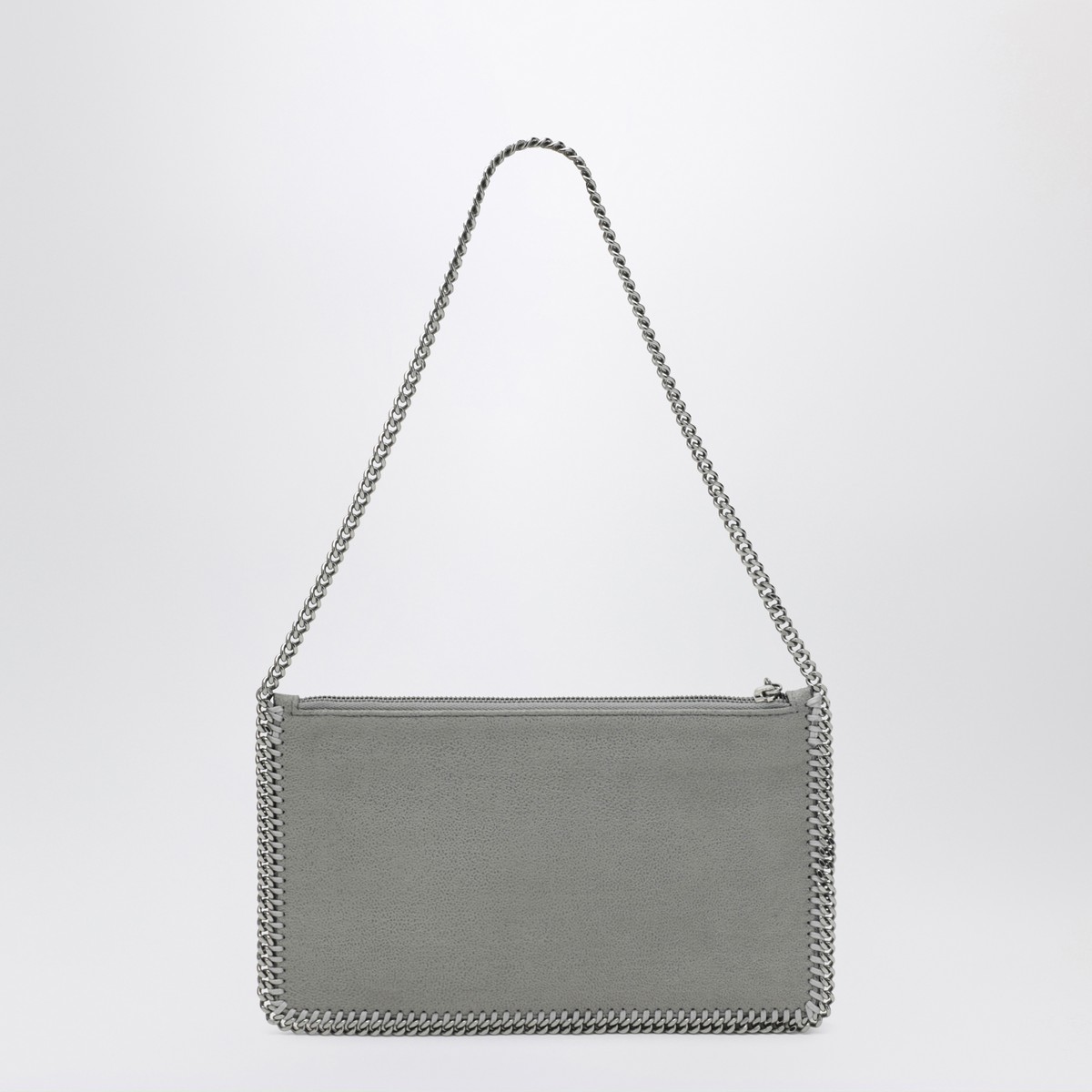 Stella McCartney shoulder pouch bag in matte vegan Shaggy Deer fabric with light grey semi-gloss grain, featuring a silver chain shoulder strap, zip closure, zipper pull with engraved logo medallion charm, and single compartment.