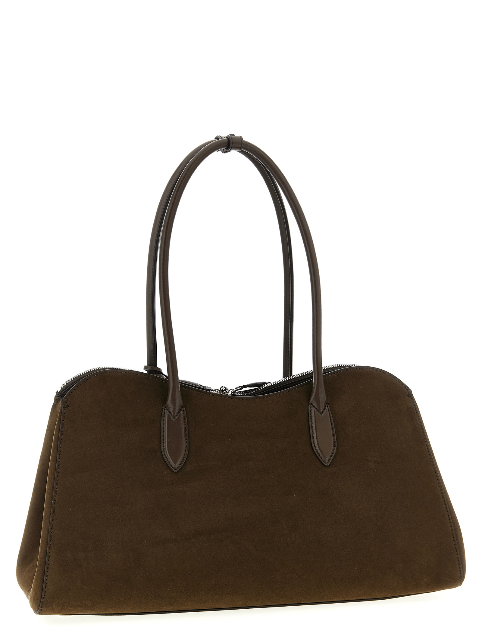 ‘ryder open’ shoulder bag in suede effect fabric, Double fixed handle, Zip compartment, Inside pocket, Metal padlock with engraved logo, Side gusset opening with snap buttons, Metal feet. Size and Fit – W 46 x H 21 x D 19 cm