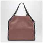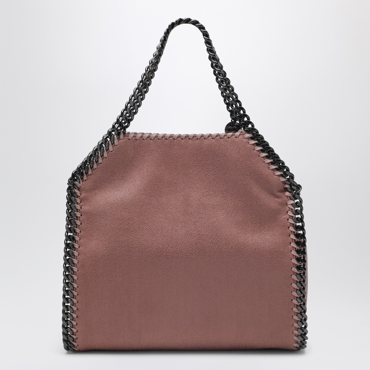 Stella McCartney mini tote bag in Sienna brown Shaggy Deer with ruthenium chain and circular logo medallion, featuring one internal flat pocket, magnetic button closure and two top handles.