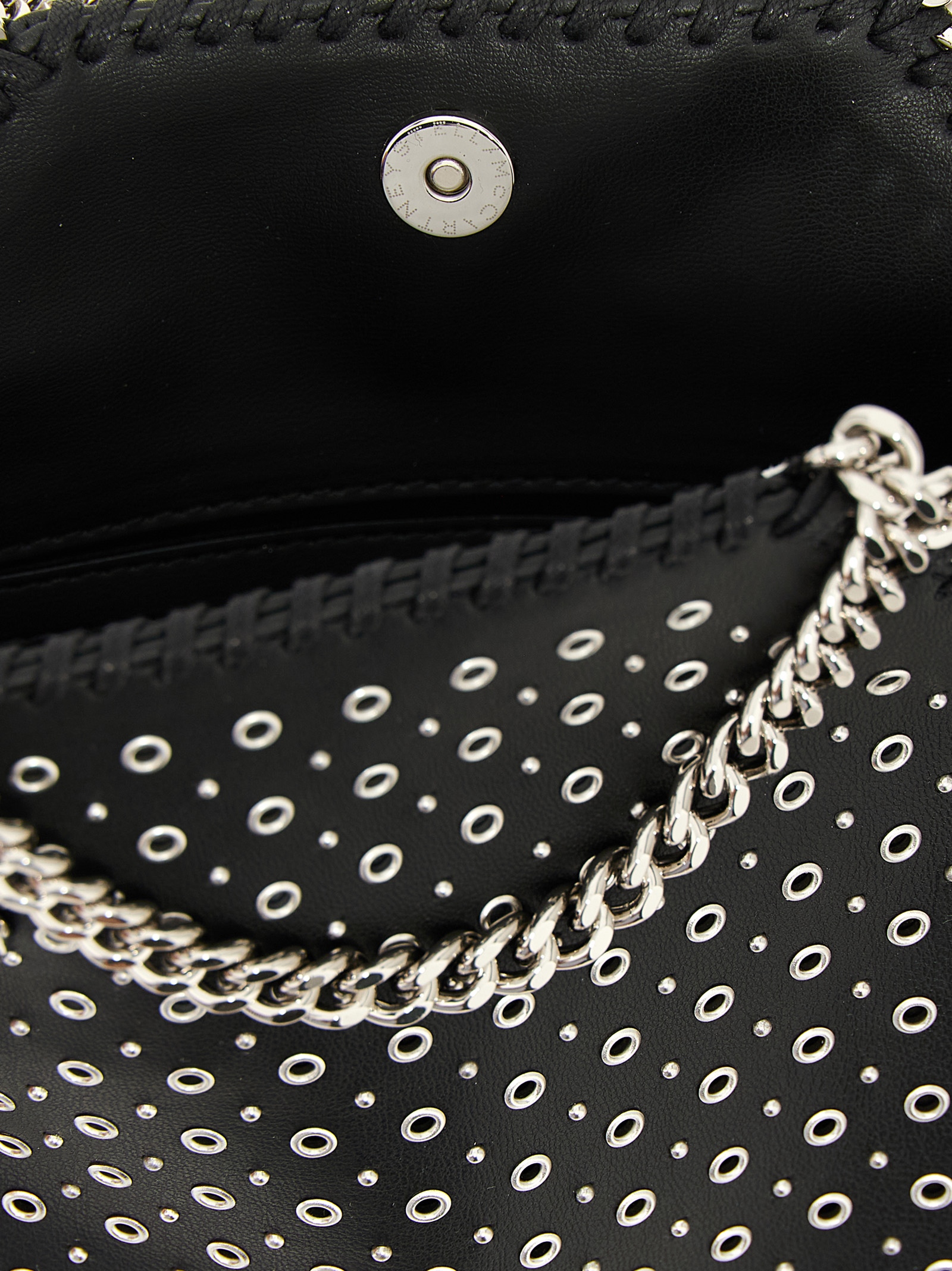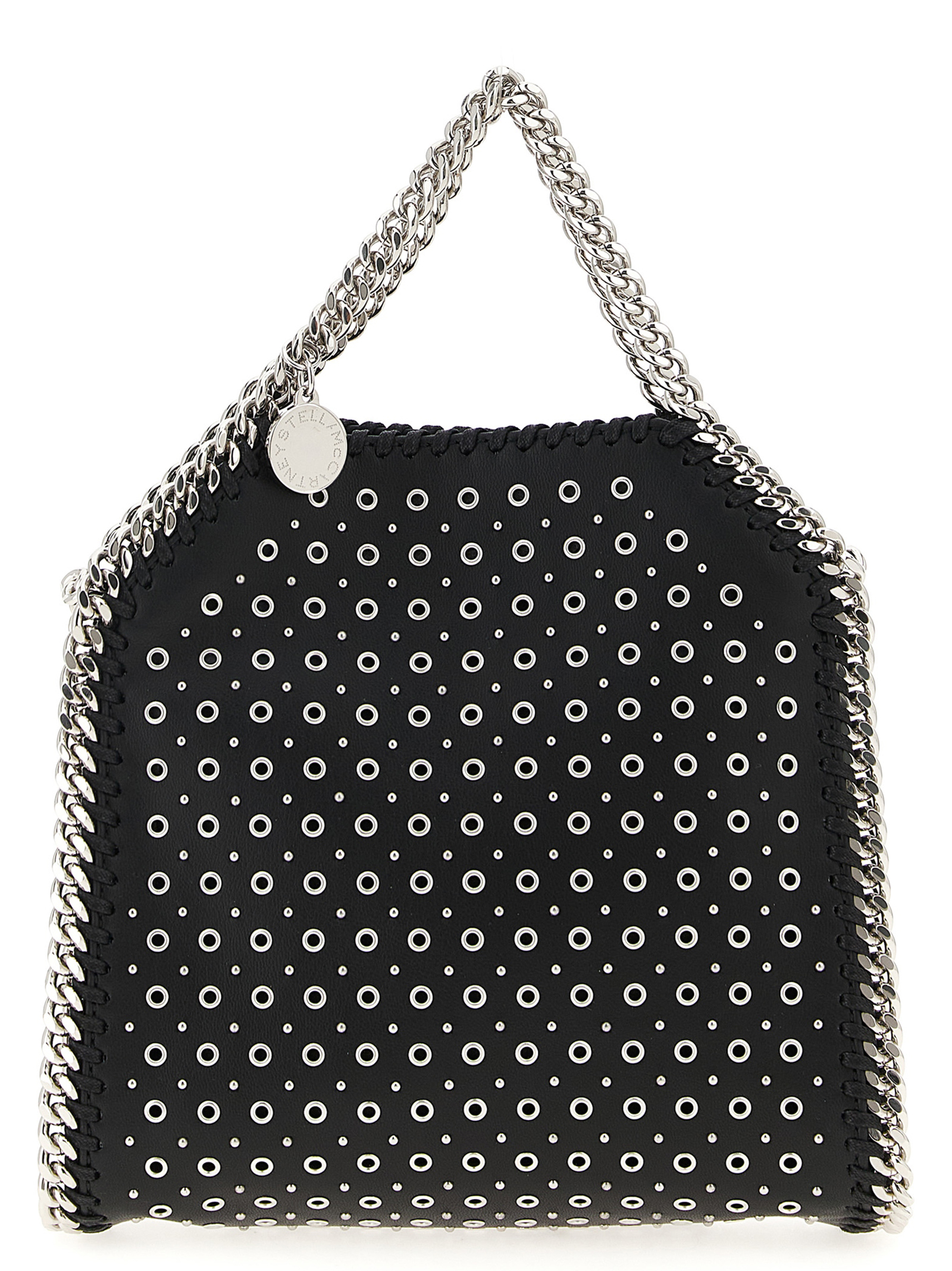 ‘tiny falabella’ handbag in leather-effect fabric with all-over metal studs, Diamond-effect chain, Double fixed handle, Magnetic closure, Chain shoulder strap, Medallion charm with engraved logo.