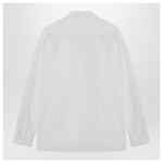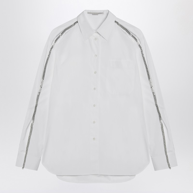 White cotton oxford shirt by Stella McCartney, featuring a front button closure, a patch pocket on the chest, pointed collar, long sleeves with Falabella chain, buttoned cuff, cut out details, and curved hem.