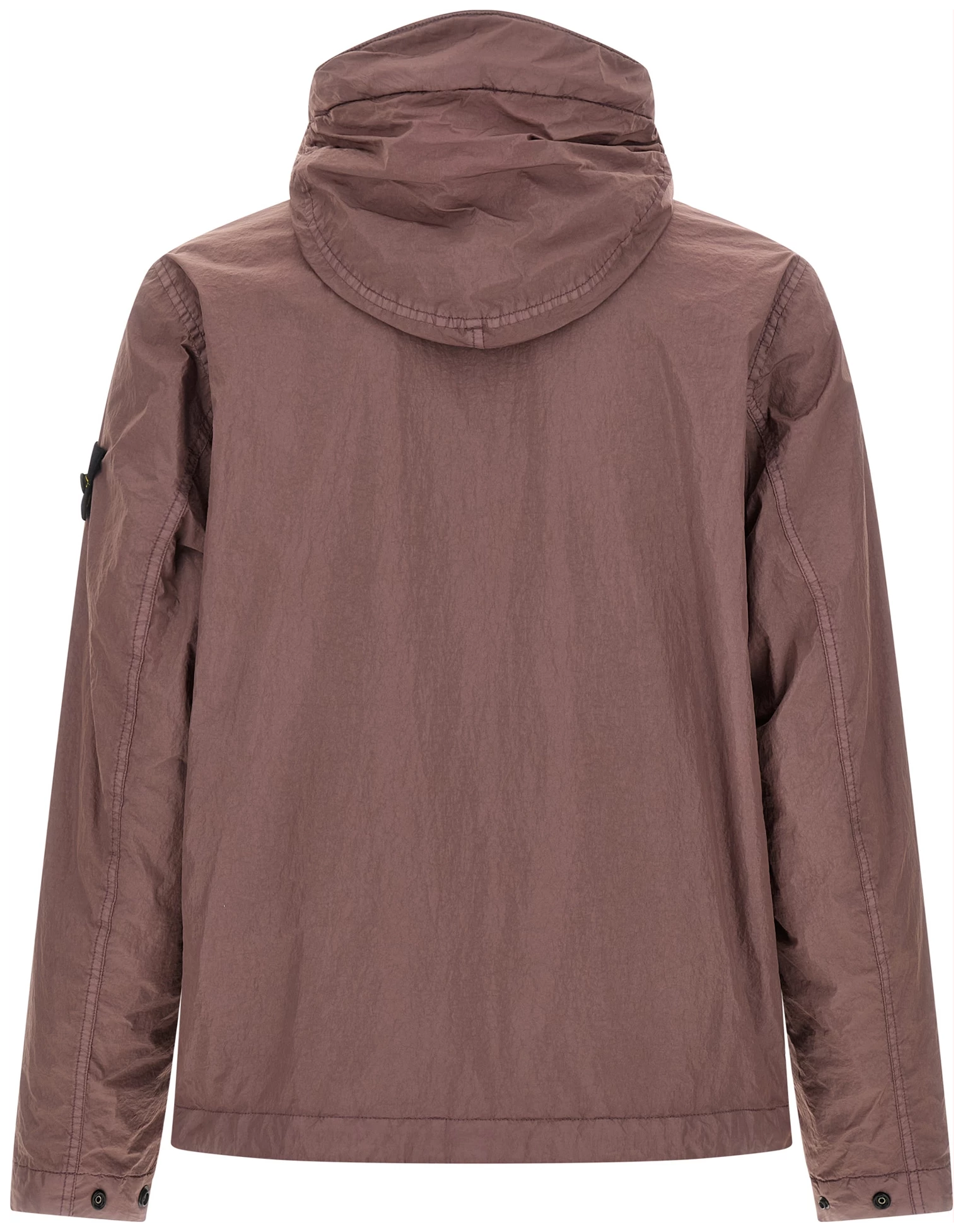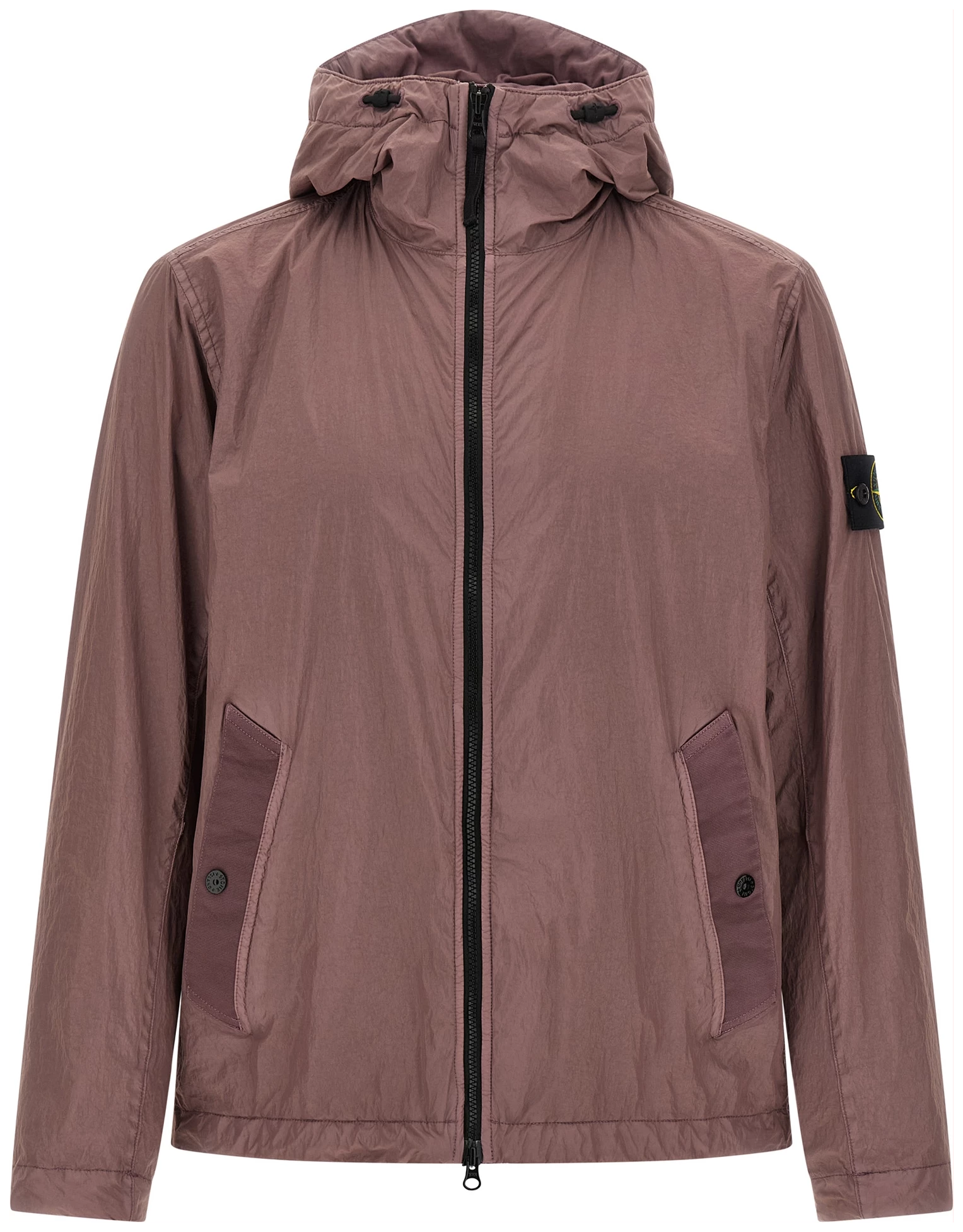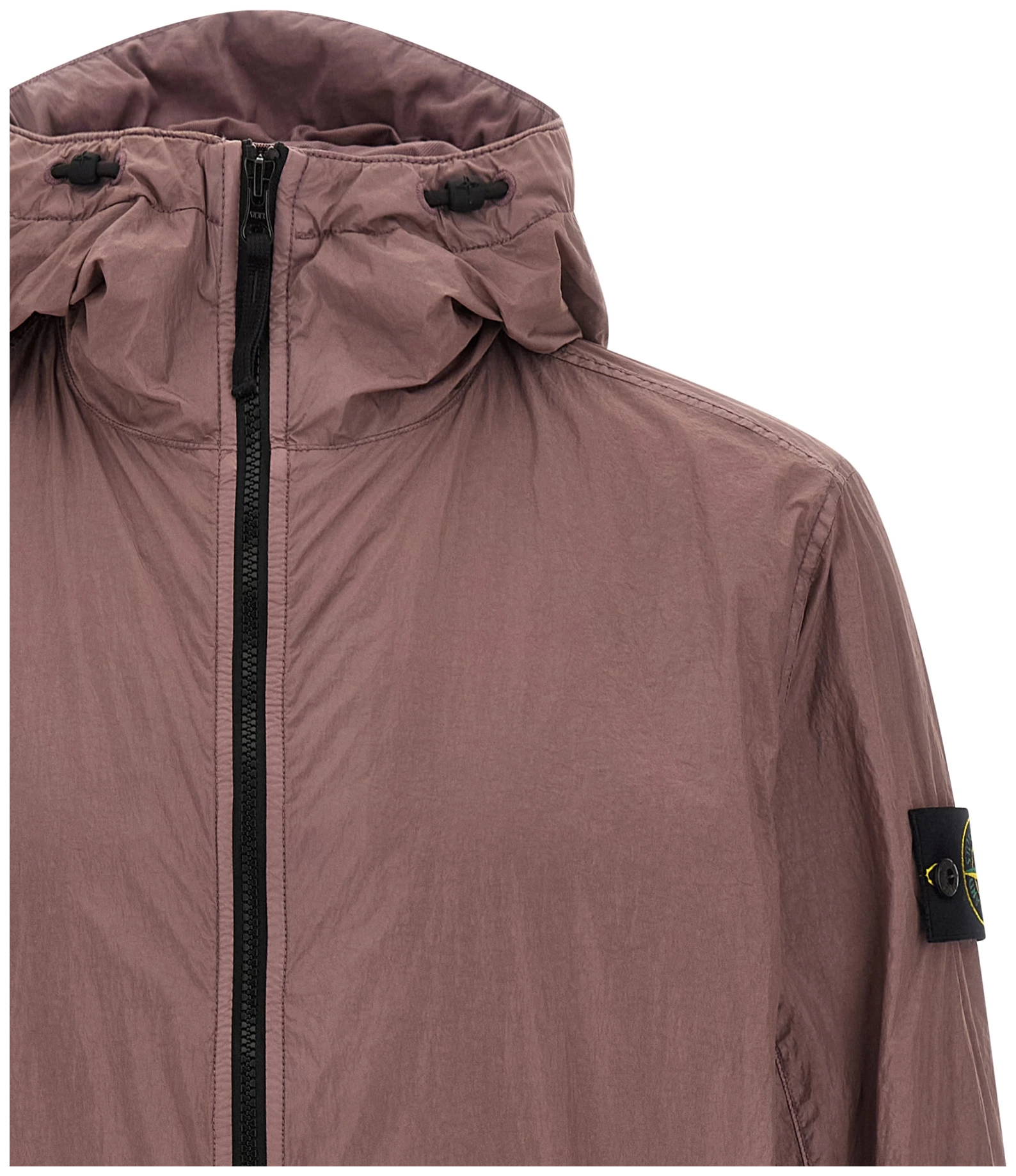 ‘4100001’ lightweight nylon reps jacket with very dense weave structure, Garment-dyed with anti-drip agent and wrinkled-effect resin treatment, Adjustable hood with shaped visor, Front zip closure, Pockets, Long sleeves with cuffs and logo badge applied, Drawstring on the hem.