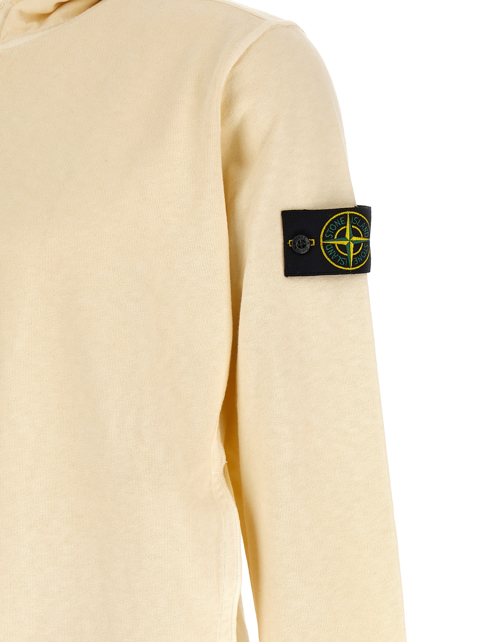 ‘6100032’ hoodie in garment-dyed flamed-effect malfilé cotton with ‘OLD’ treatment, front zip closure, pockets, long sleeves with cuffs, logo badge, and headband on the hem.