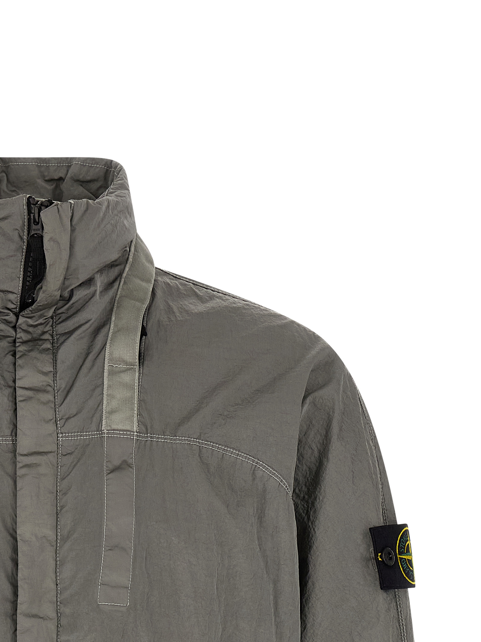 Slightly water-repellent nylon metal watro bomber jacket with iridescent metallic appearance with ribbed stretch knit details, Stand-up collar with removable hood, Front hidden zip closure, Pockets, Long cuffed sleeves, Logo badge, Headband.