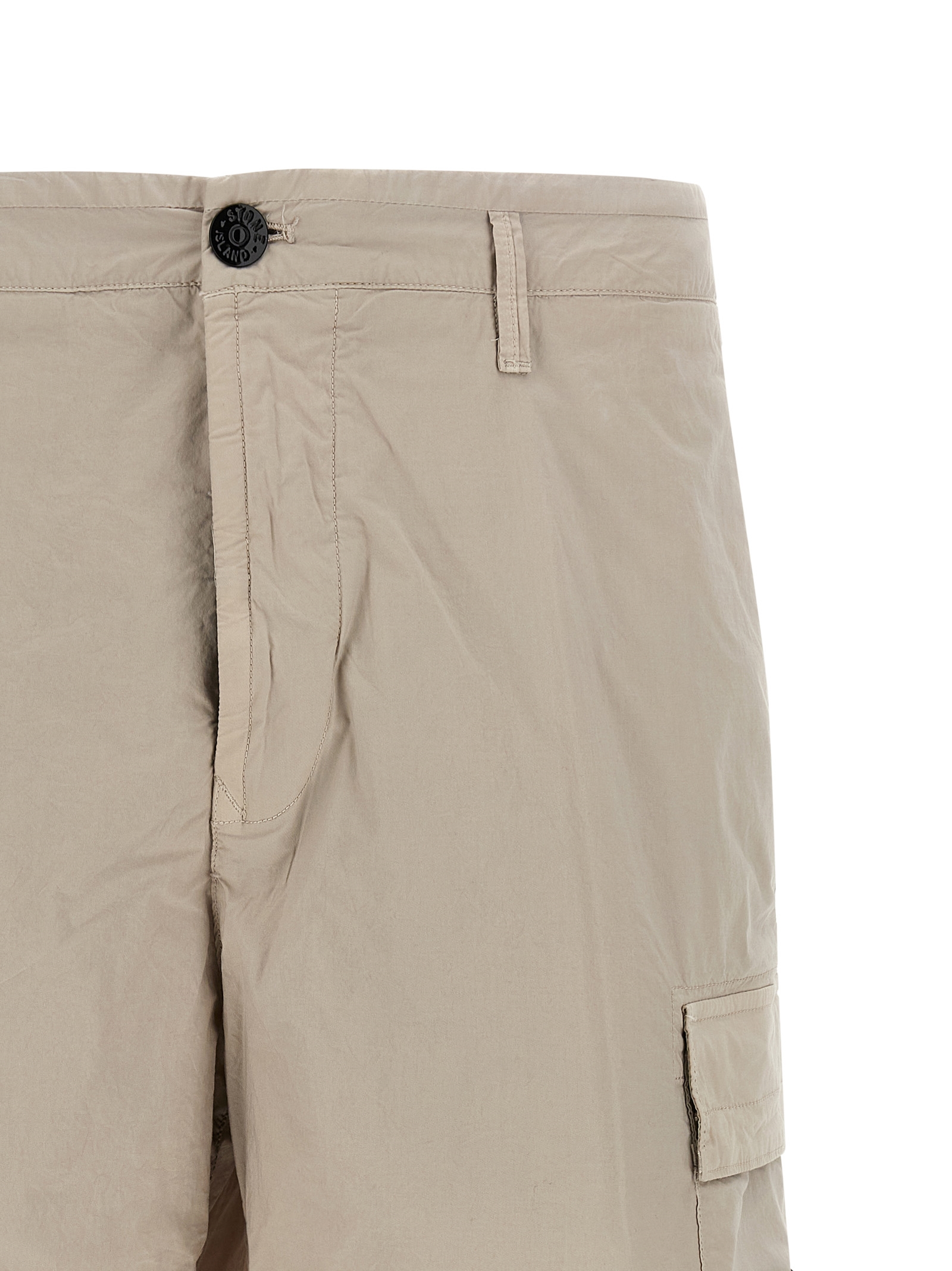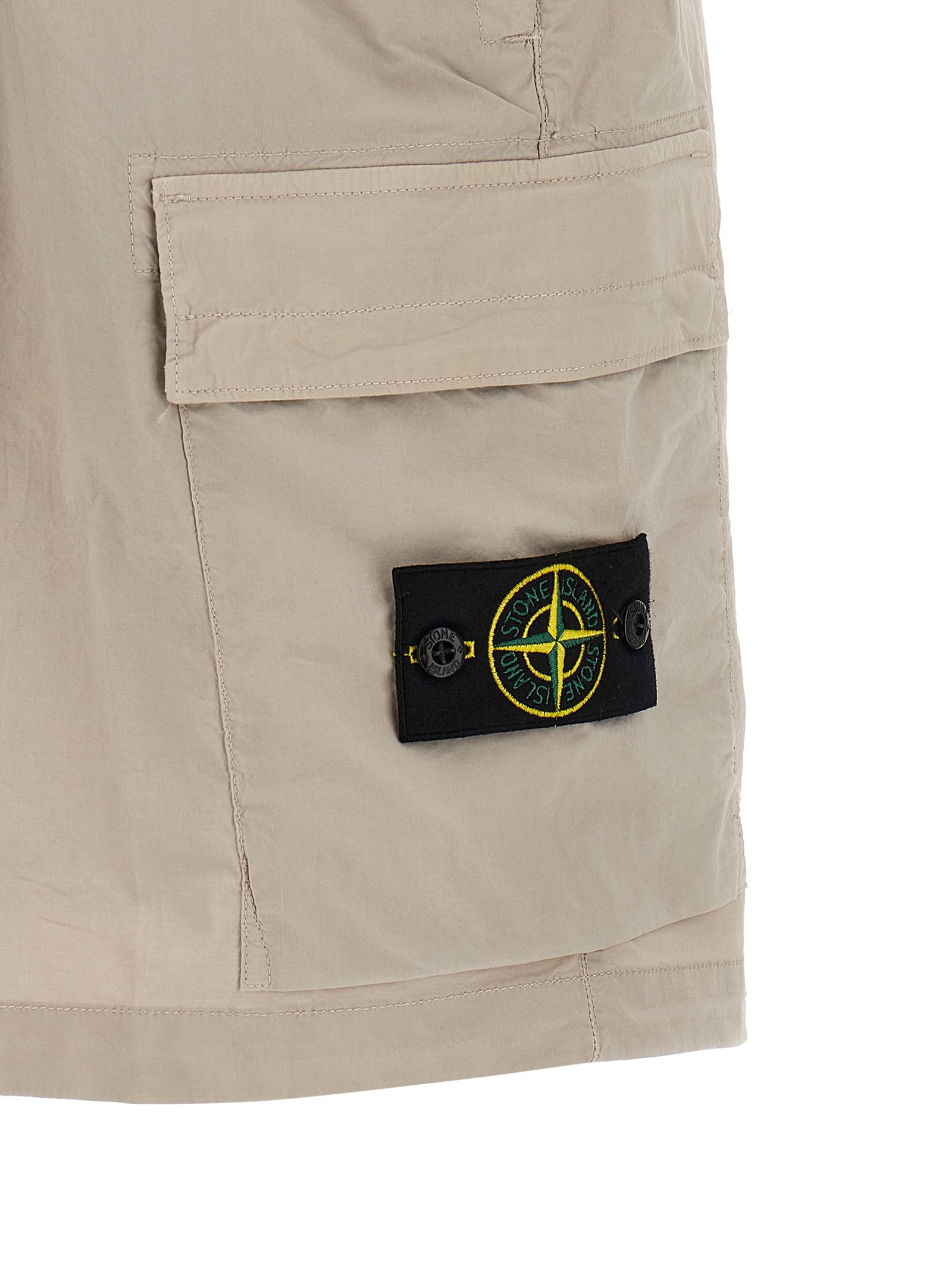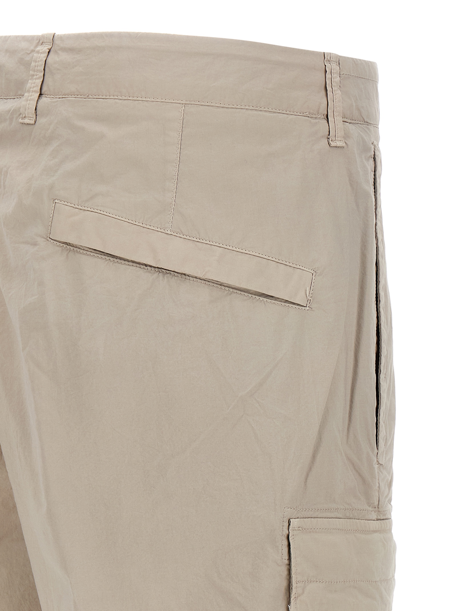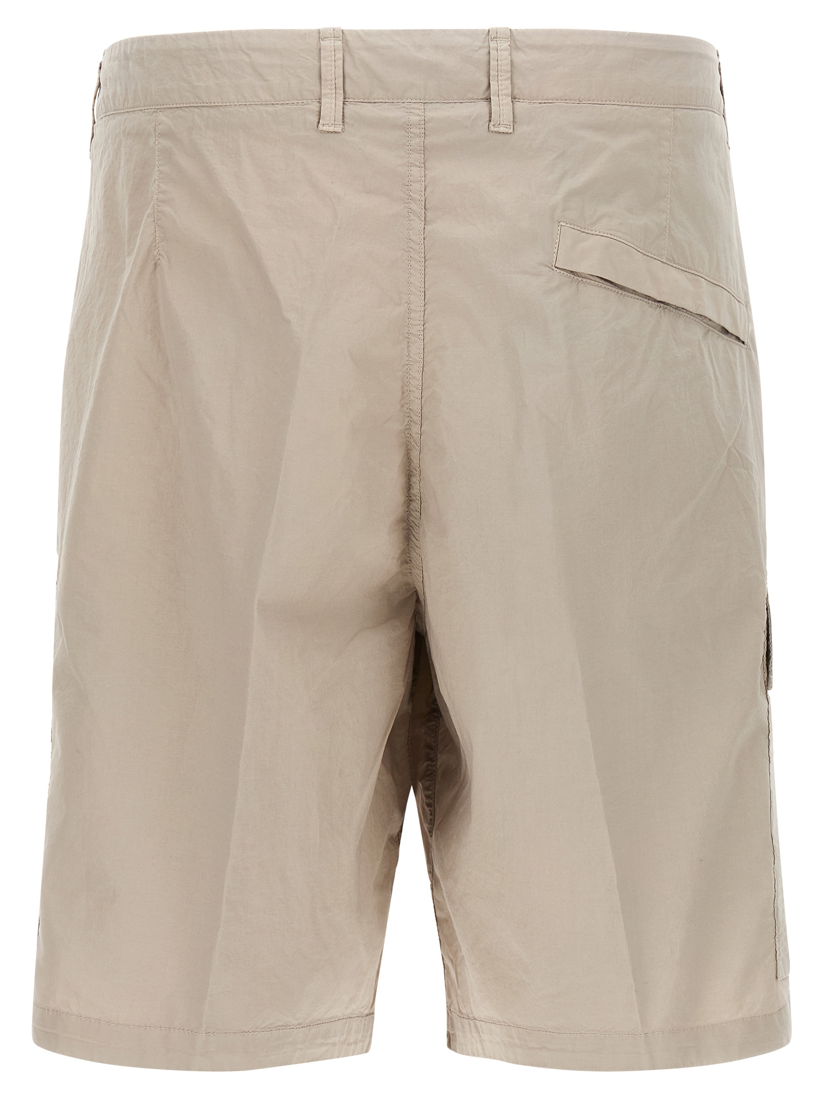 ‘L100020’ bermuda shorts in light ‘Paracadute’ garment-dyed stretch cotton canvas, cargo style with side pockets and logo badge, zip and front button closure, pockets.