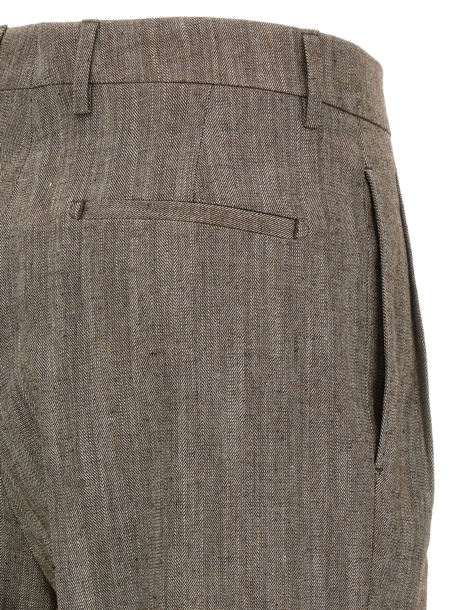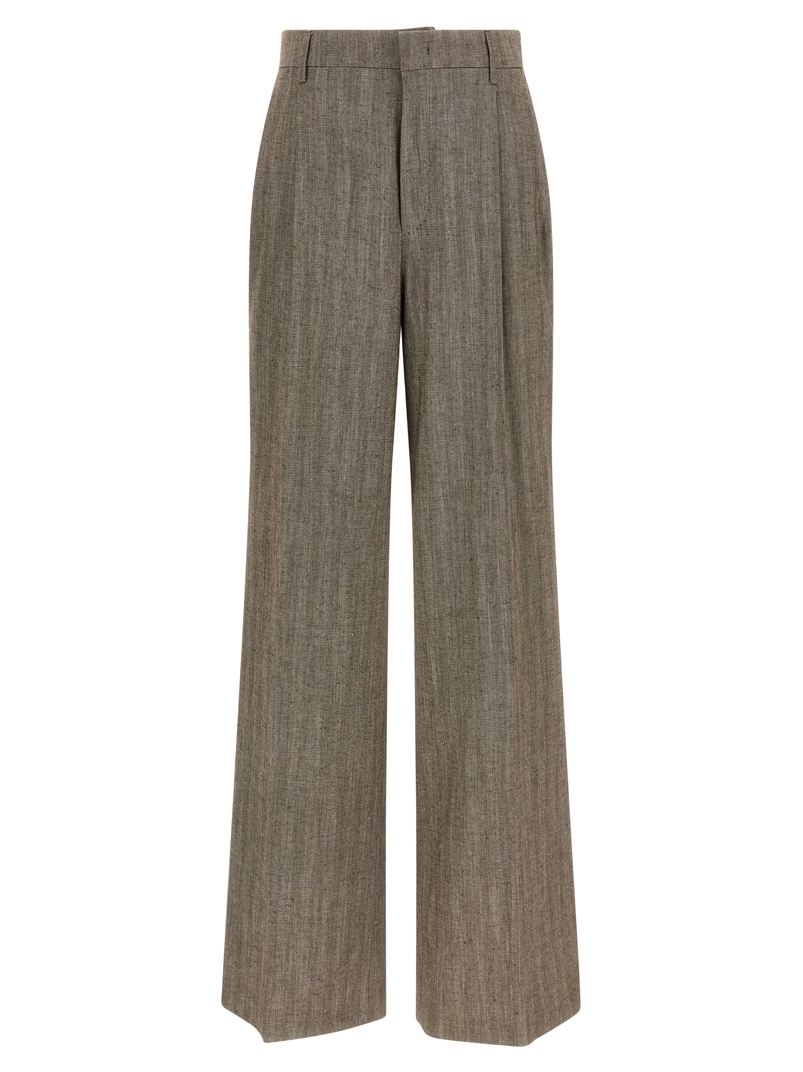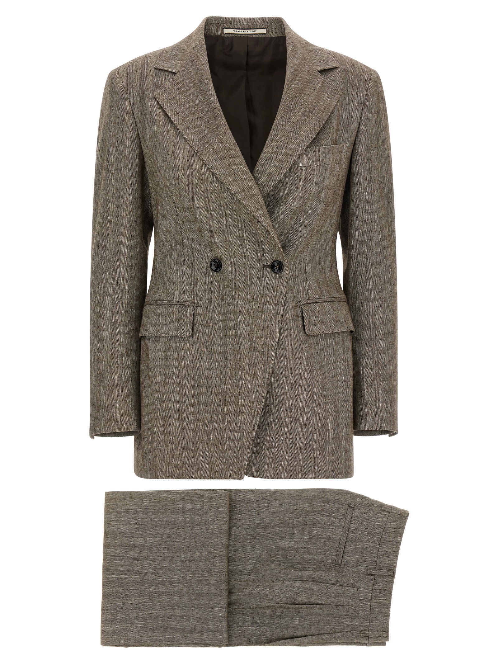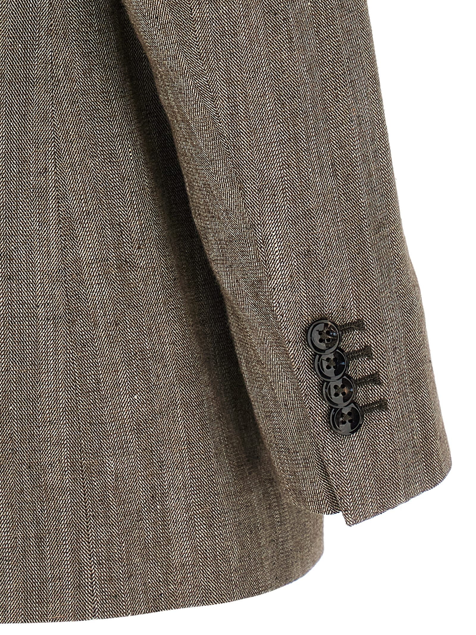 ‘astra’ dress in viscose, Linen and cotton blend with chevron pattern, Consisting of double-breasted blazer with two front horn button closure, Mirror lapels, Breast pocket, Flap pockets, Structured shoulder strap, Long sleeves, Back split, Cupro lining and trousers with stretched pleat, Wide and straight leg, Pin tucks, Front french pockets, Back welt pockets, Zip and front hook closure, Cotton lining.