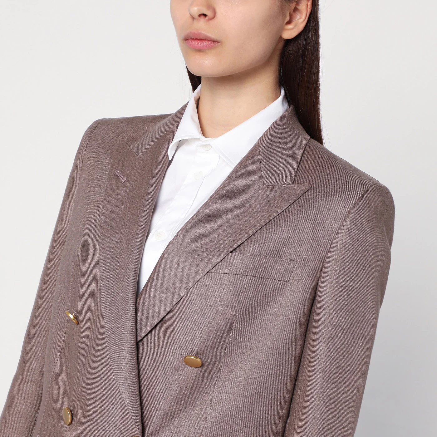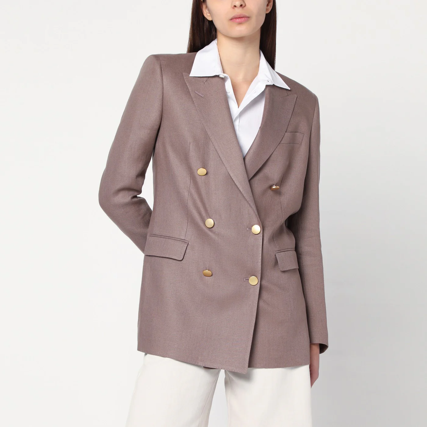 Double-breasted linen jacket by Tagliatore in brown characterized by pointed lapels a welt pocket on the chest long sleeves with buttoned cuffs two flap pockets on the front a back vent and a front closure with golden buttons.