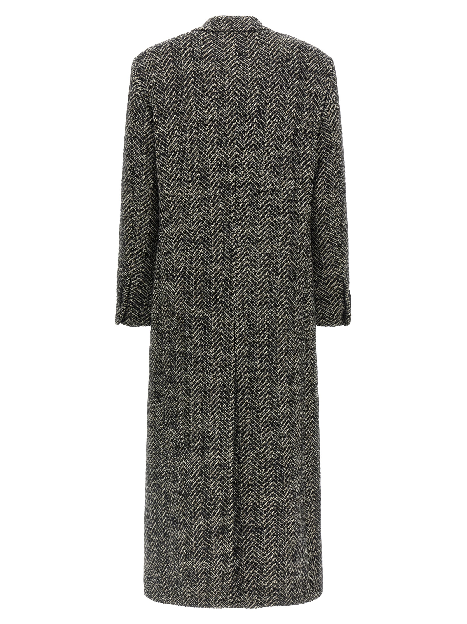 Extra long ‘Caitlyn’ double-breasted bouclé wool bouclé herringbone coat with front button closure, breast pocket, flap pockets, structured shoulder strap, long sleeves, back split, monogram cupro lining.