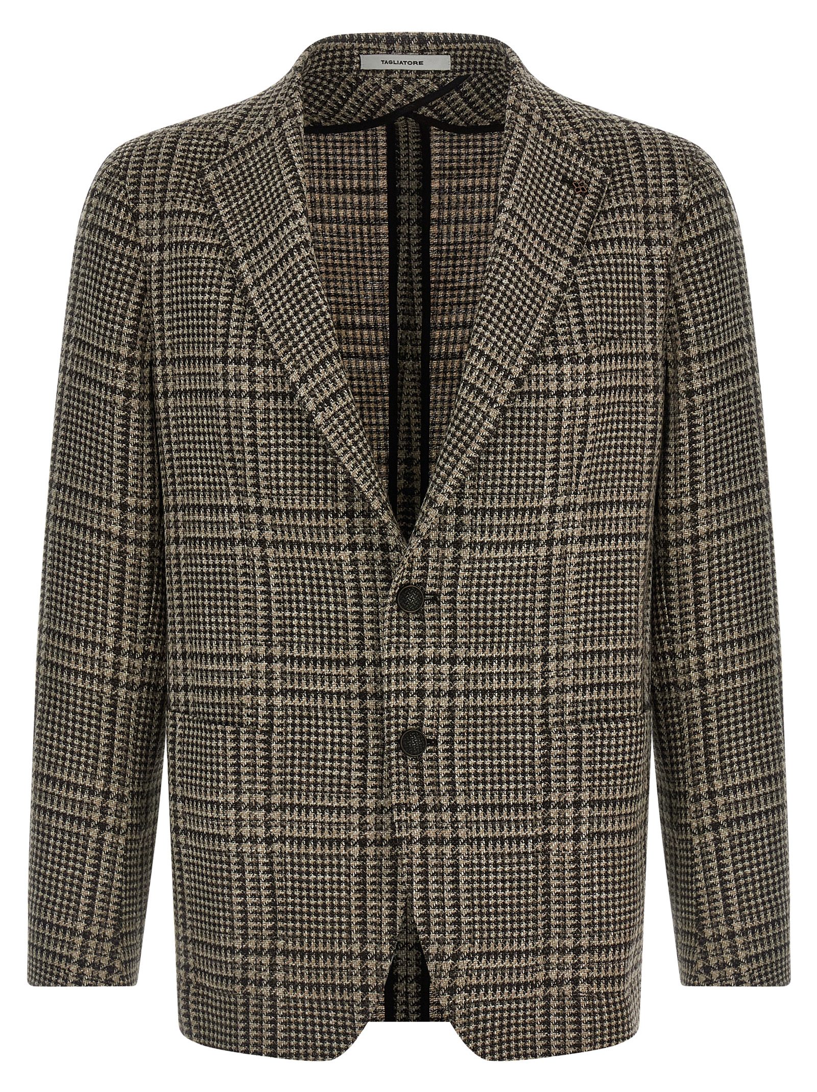 ‘Exclusive Garment’ line houndstooth blazer in wool and silk blend with deconstructed single-breasted model with front button closure, mirror lapels with removable metal brooch, breast pocket, patch pockets, cuffs with open buttonholes, back vents, unlined.
