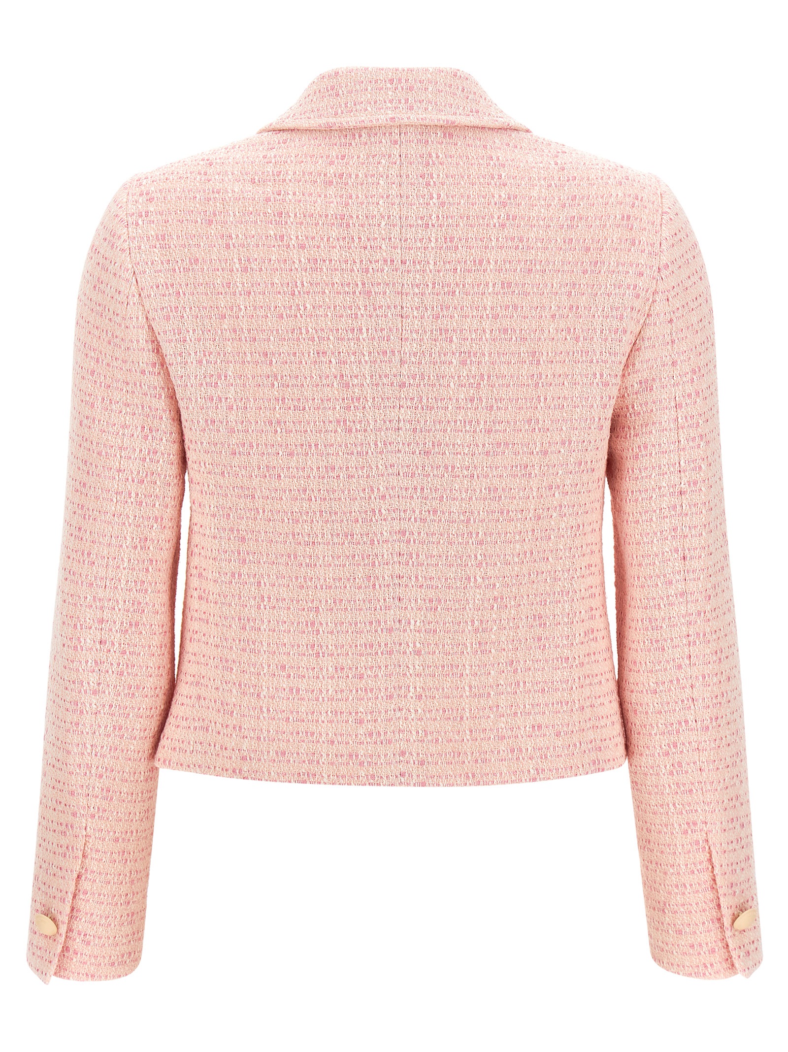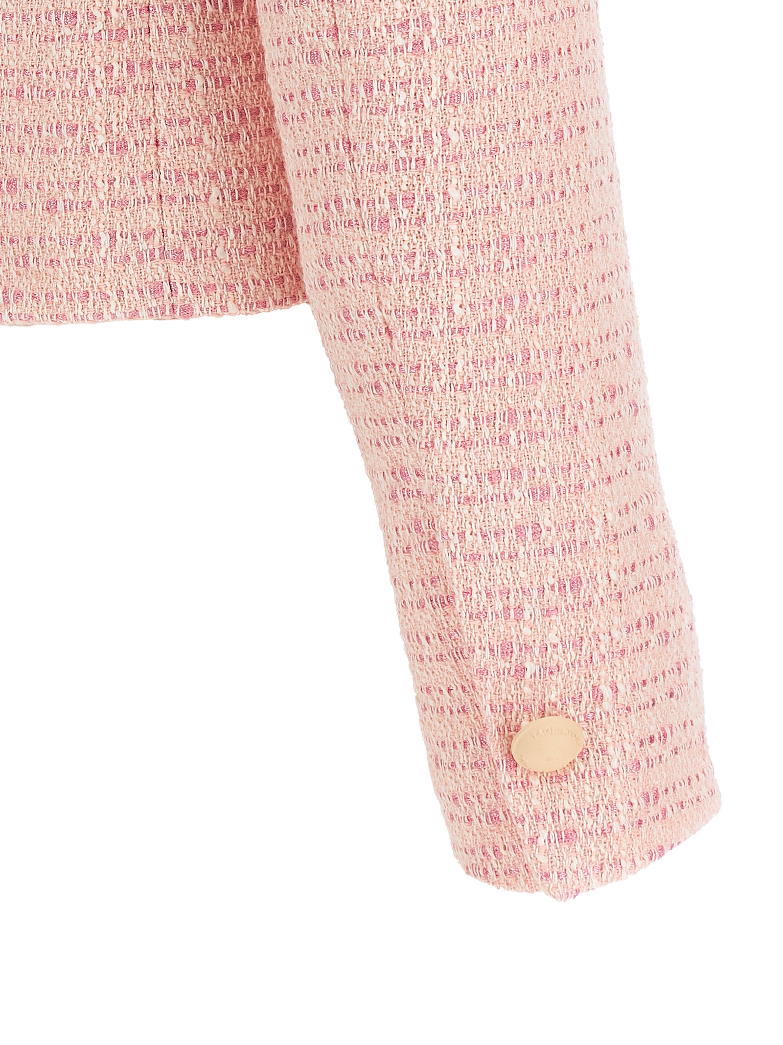 ‘idelle’ cropped blazer in bouclé cotton blend with rounded shirt collar, Front metal button closure, Patch pockets, Structured shoulder strap, Long sleeves with slit and button on the cuffs, Cupro lining.