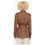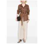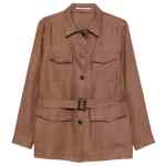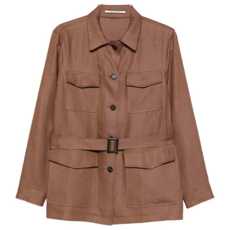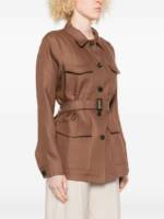 brown button fastening point collar chest flap pockets front flap pockets belt Linen jacket.