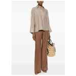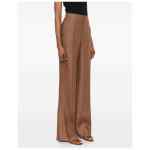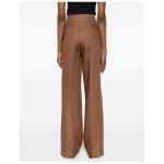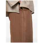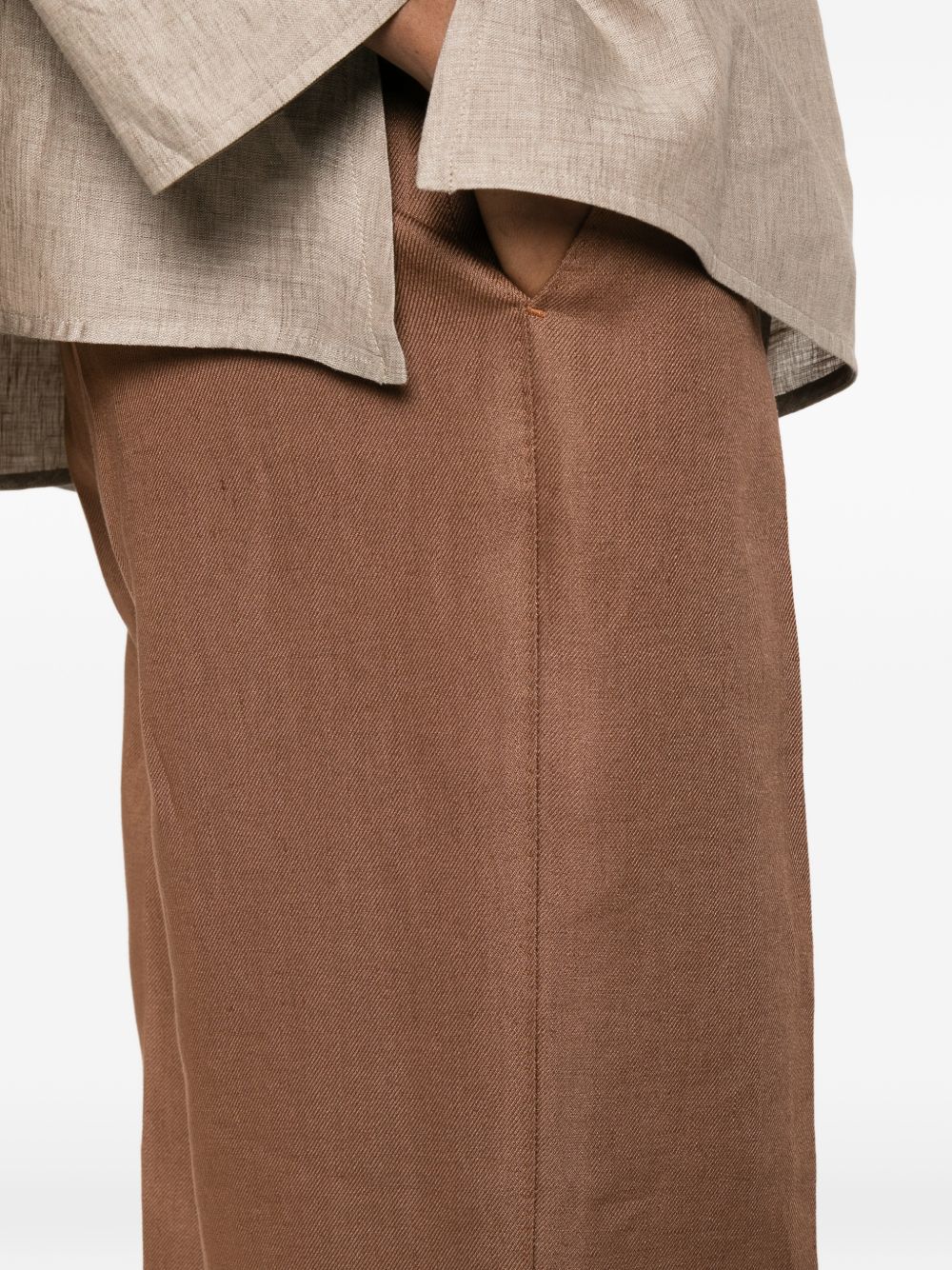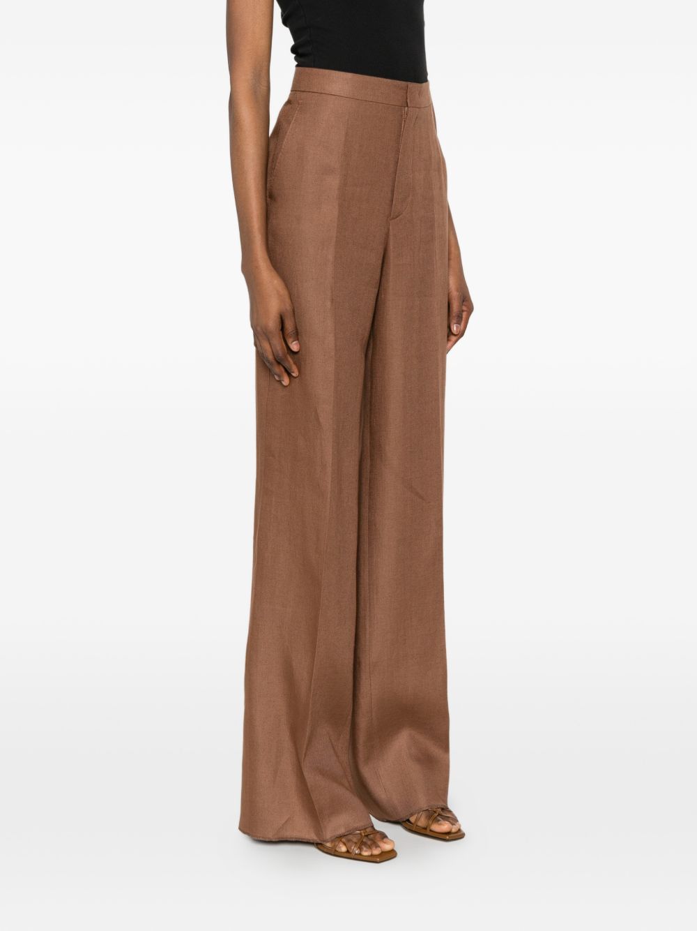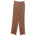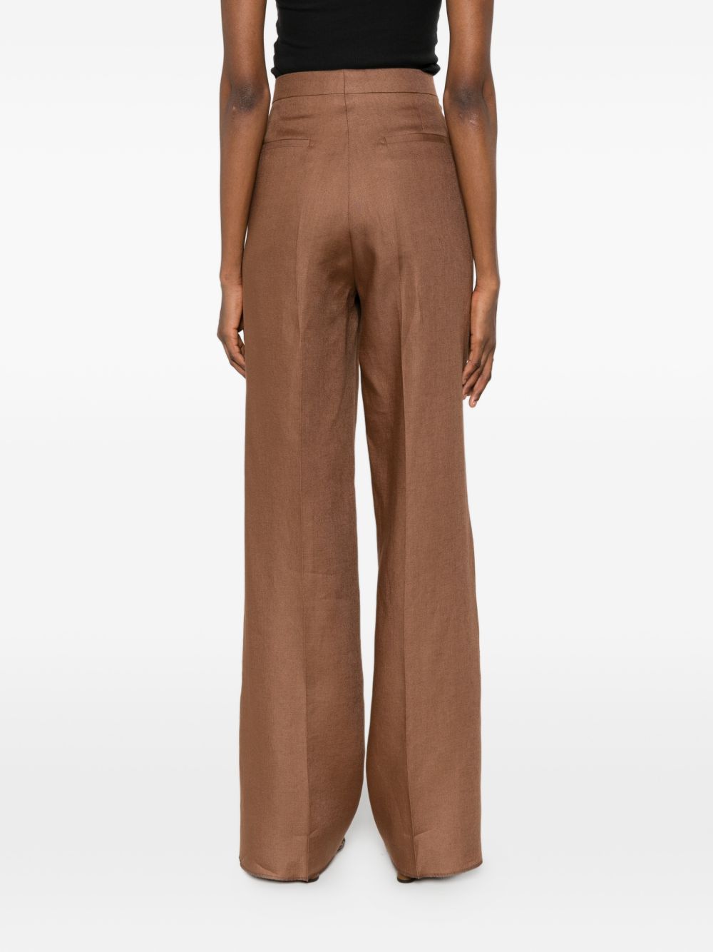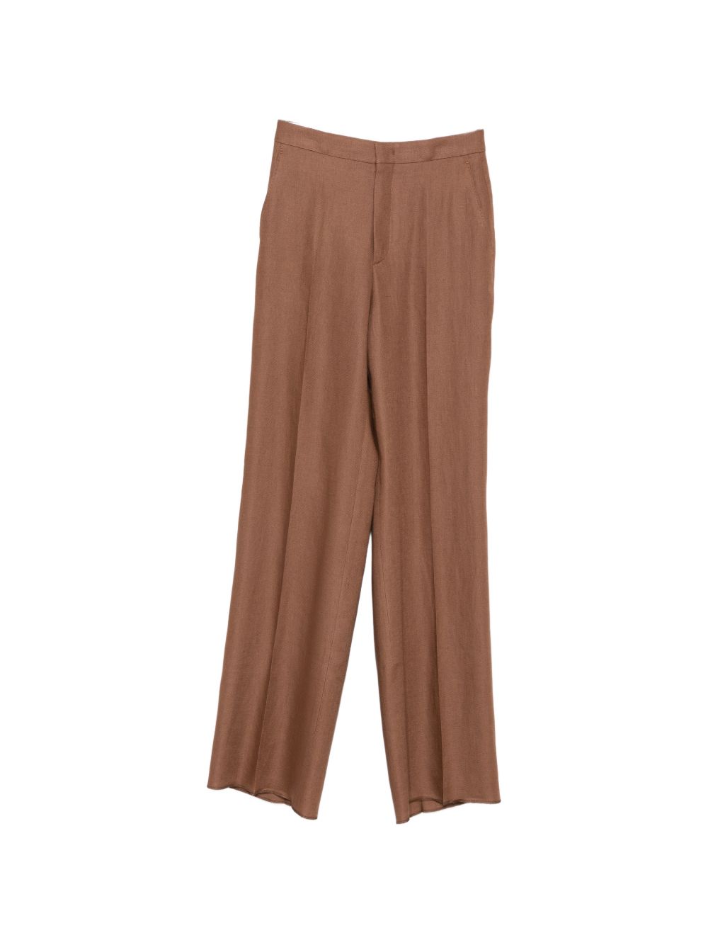 brown textured finish concealed front fastening belt loops two side slit pockets pressed crease straight leg Linen trousers.