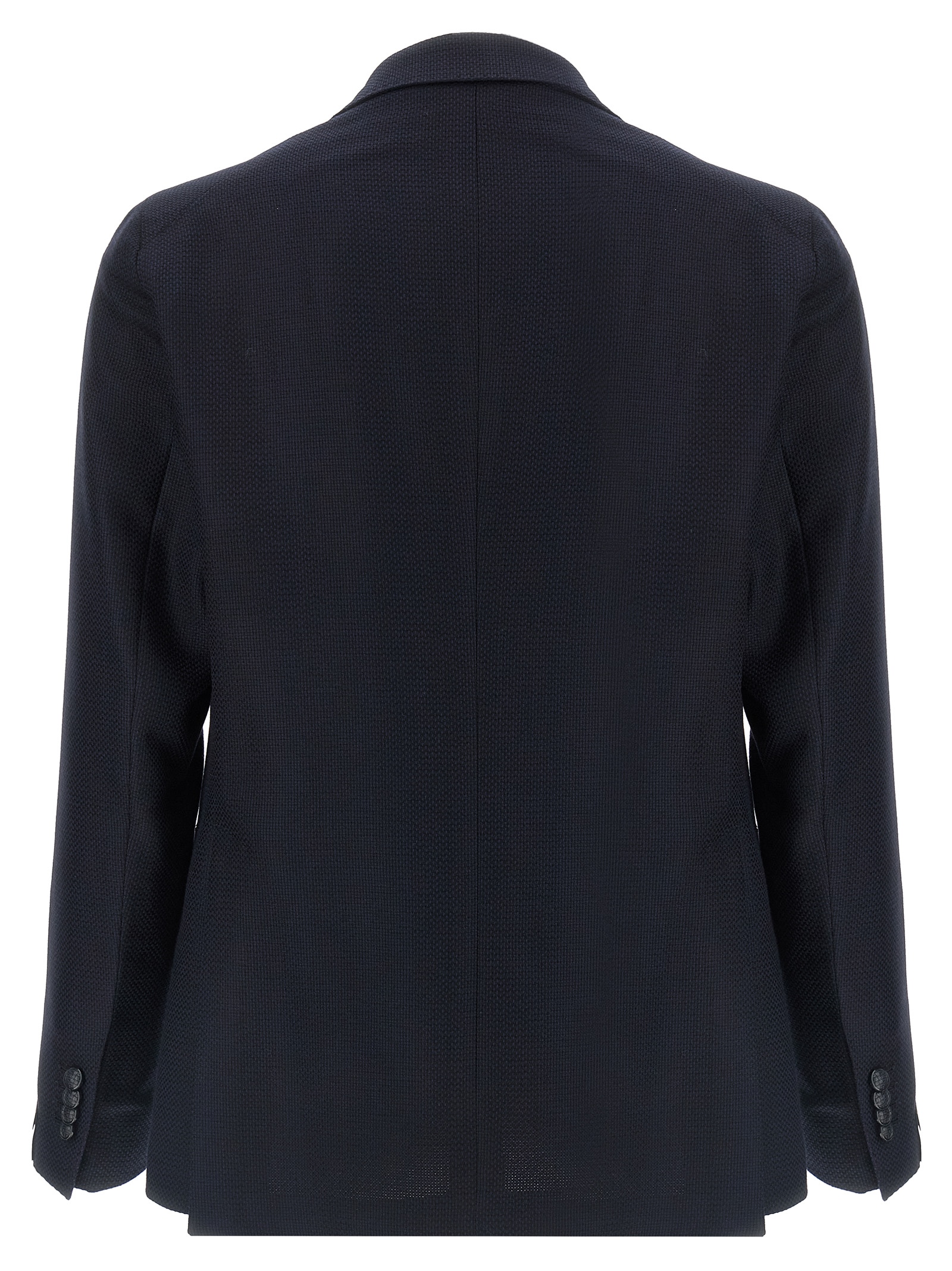Super 100’s virgin wool blazer micro checkered weave, single-breasted unstructured model with front button closure, unlined, peak lapels with removable metal brooch, breast pocket, patch pockets, cuffs with open buttonholes, back vents.