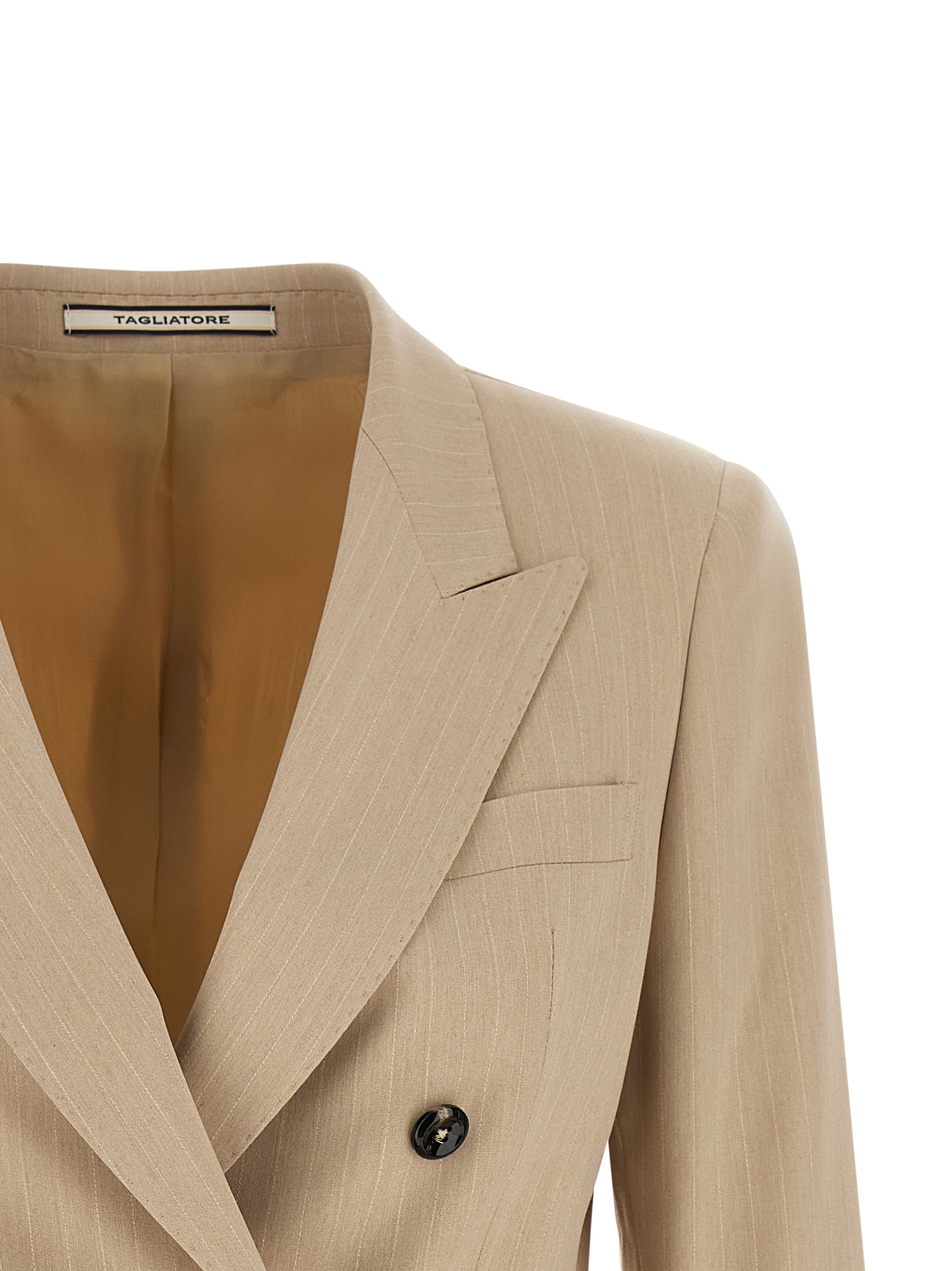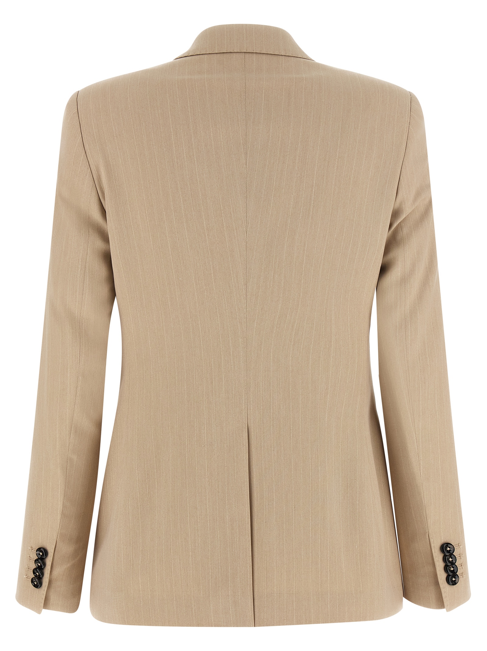 ‘parigi’ double-breasted blazer in pinstriped viscose blend woven with lamé thread, Front horn button closure, Peak lapels, Breast pocket, Flap pockets, Padded shoulder, Long sleeves, Back split, Cupro lining. Size and Fit – true to size fit