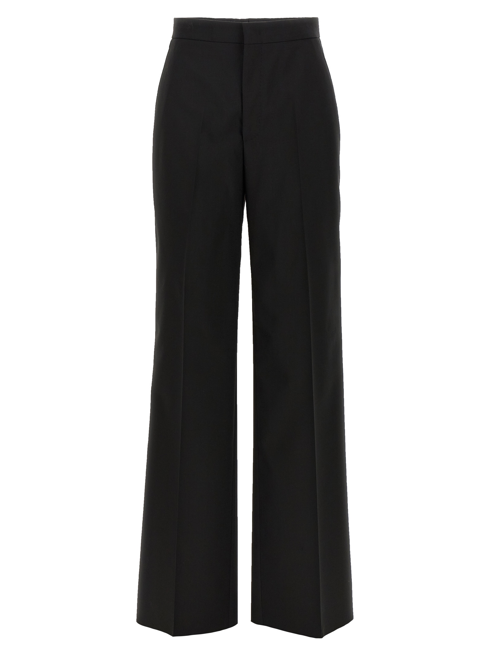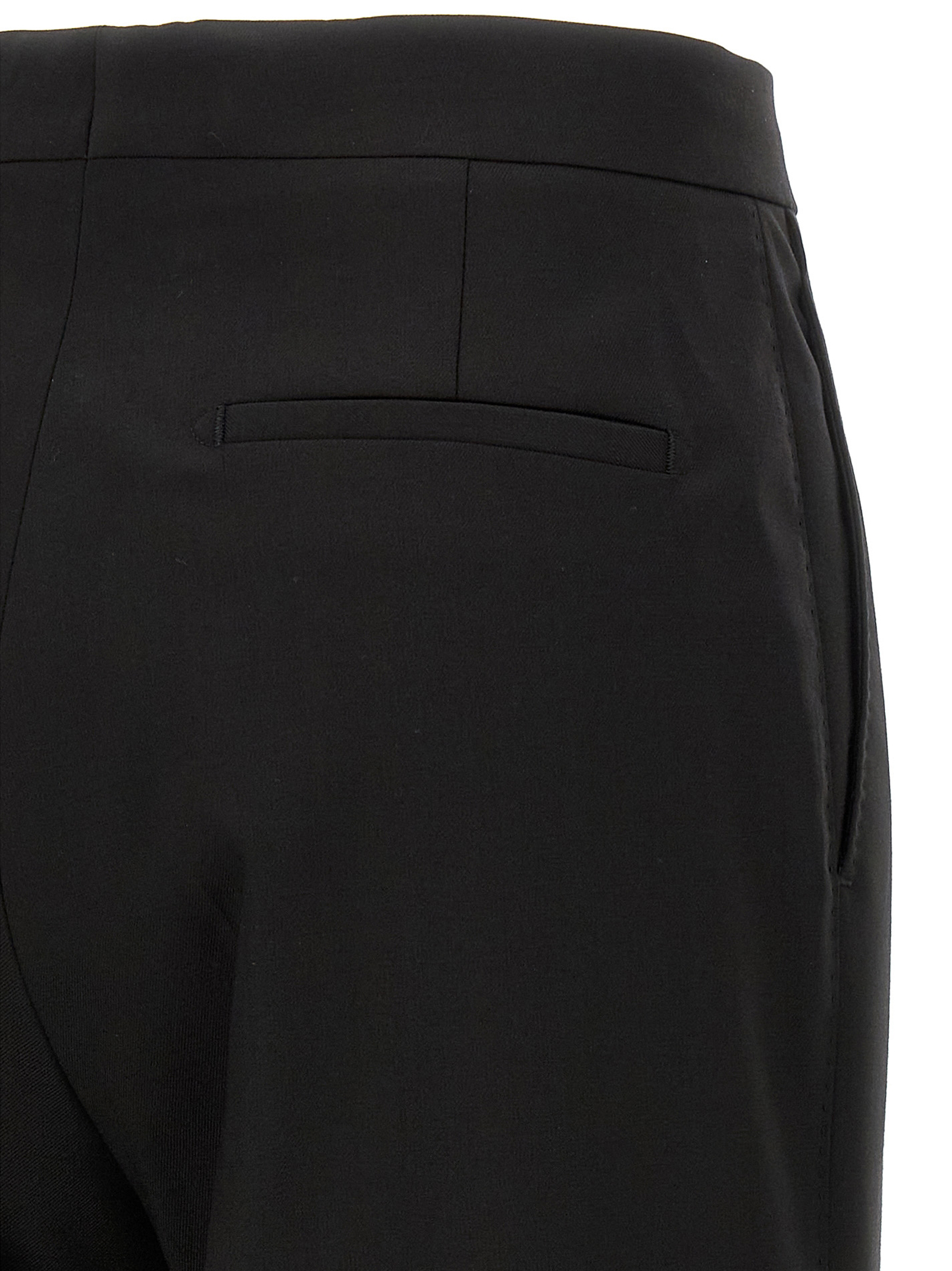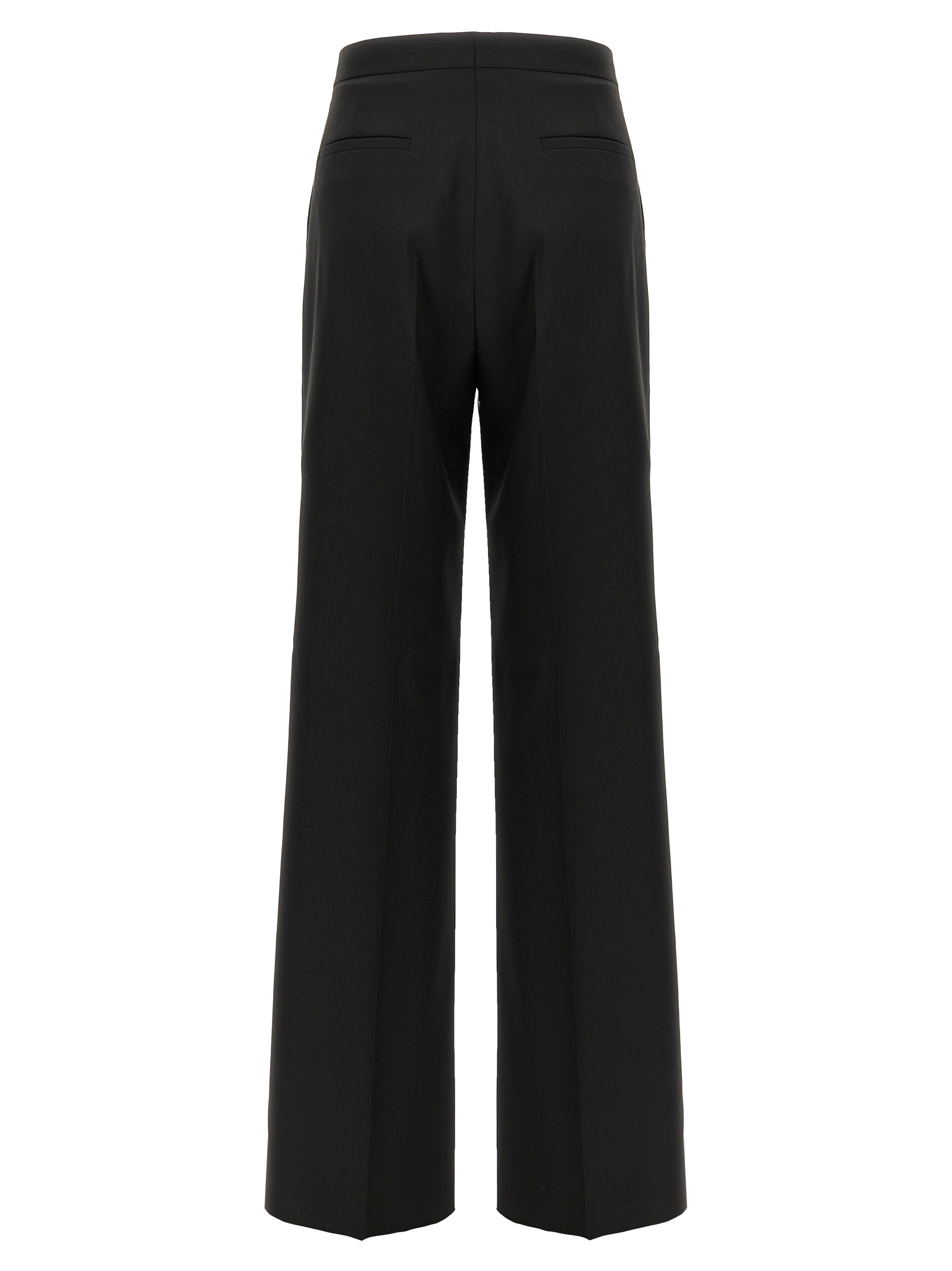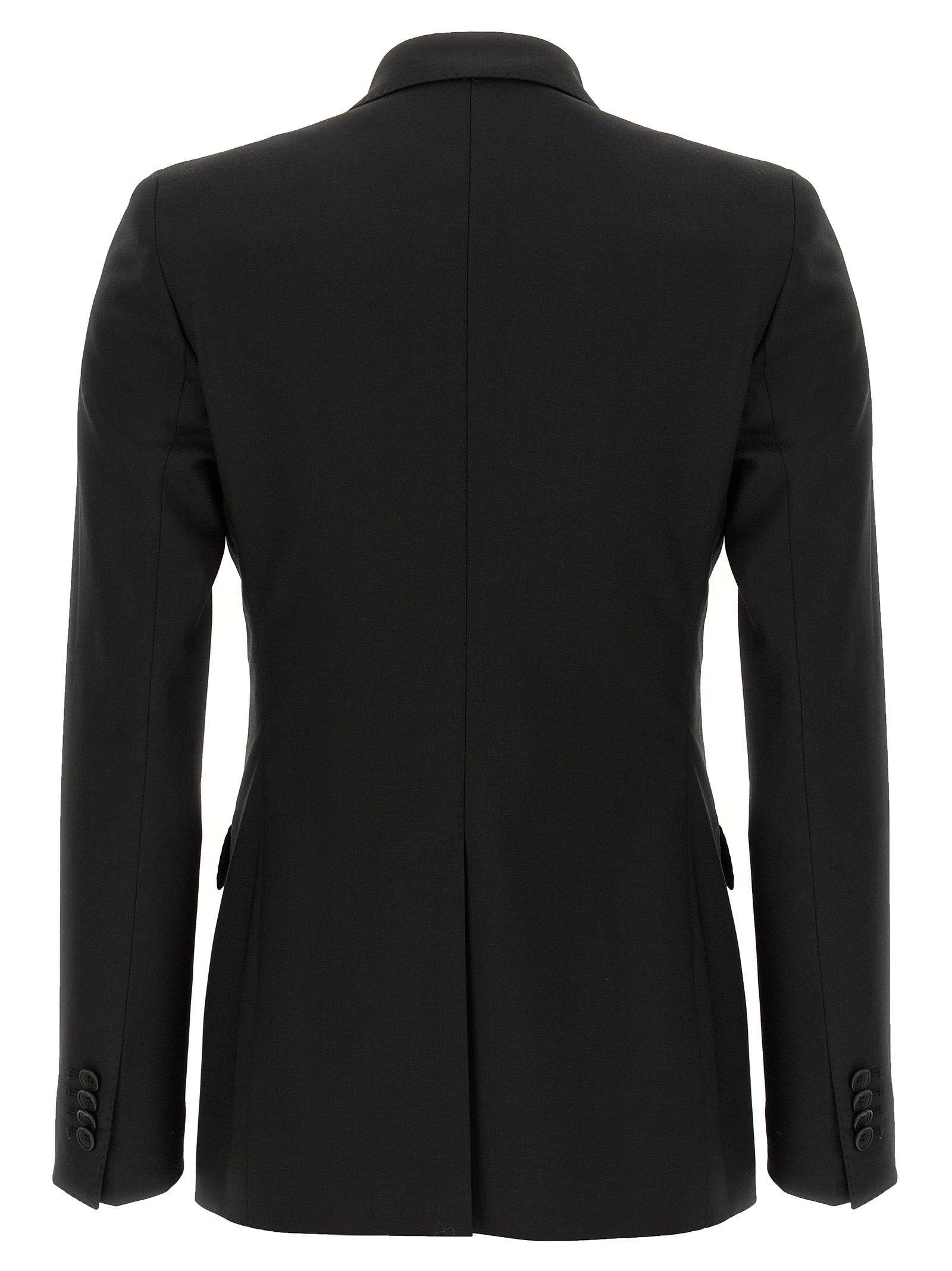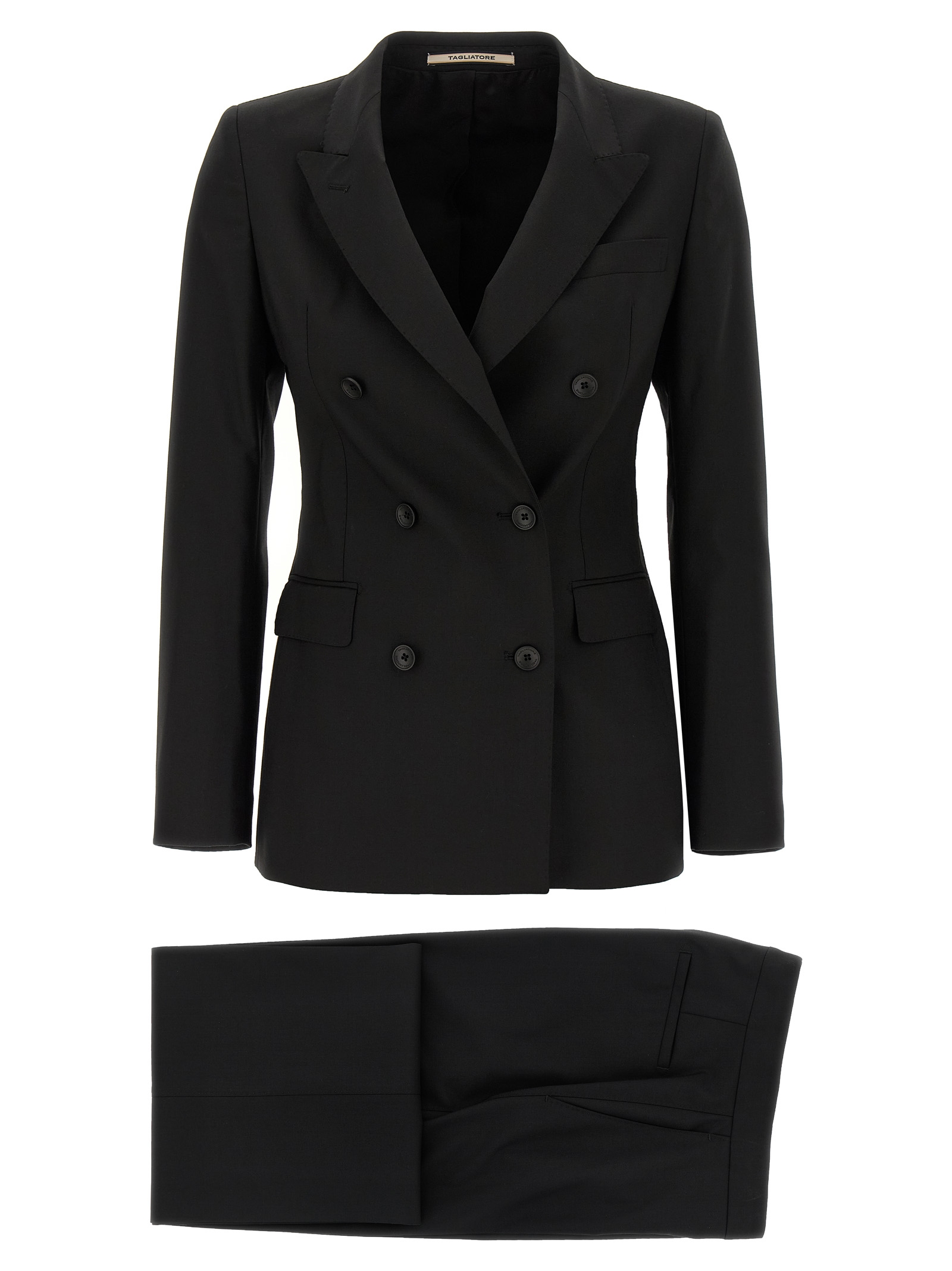 ‘Parigi’ dress in stretch fabric consisting of double-breasted blazer with button closure, peak lapels, padded shoulders, long sleeves, back slit and pants with ironed pleat, zip and hook closure, pockets.