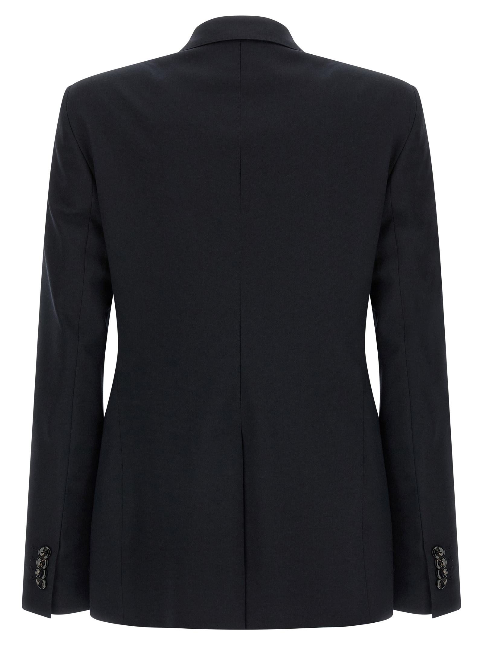 ‘Parigi’ dress in stretch fabric consisting of double-breasted blazer with button closure, peak lapels, padded shoulders, long sleeves, back split and straight high-waisted trousers, with central stretched pleat, zip and hook closure, pockets.