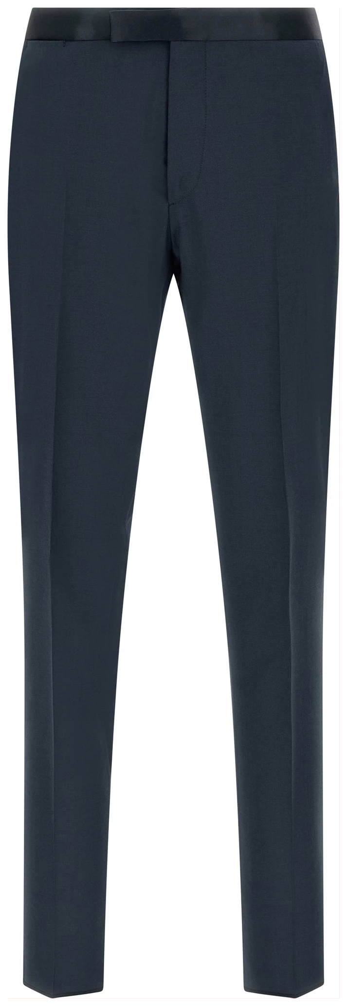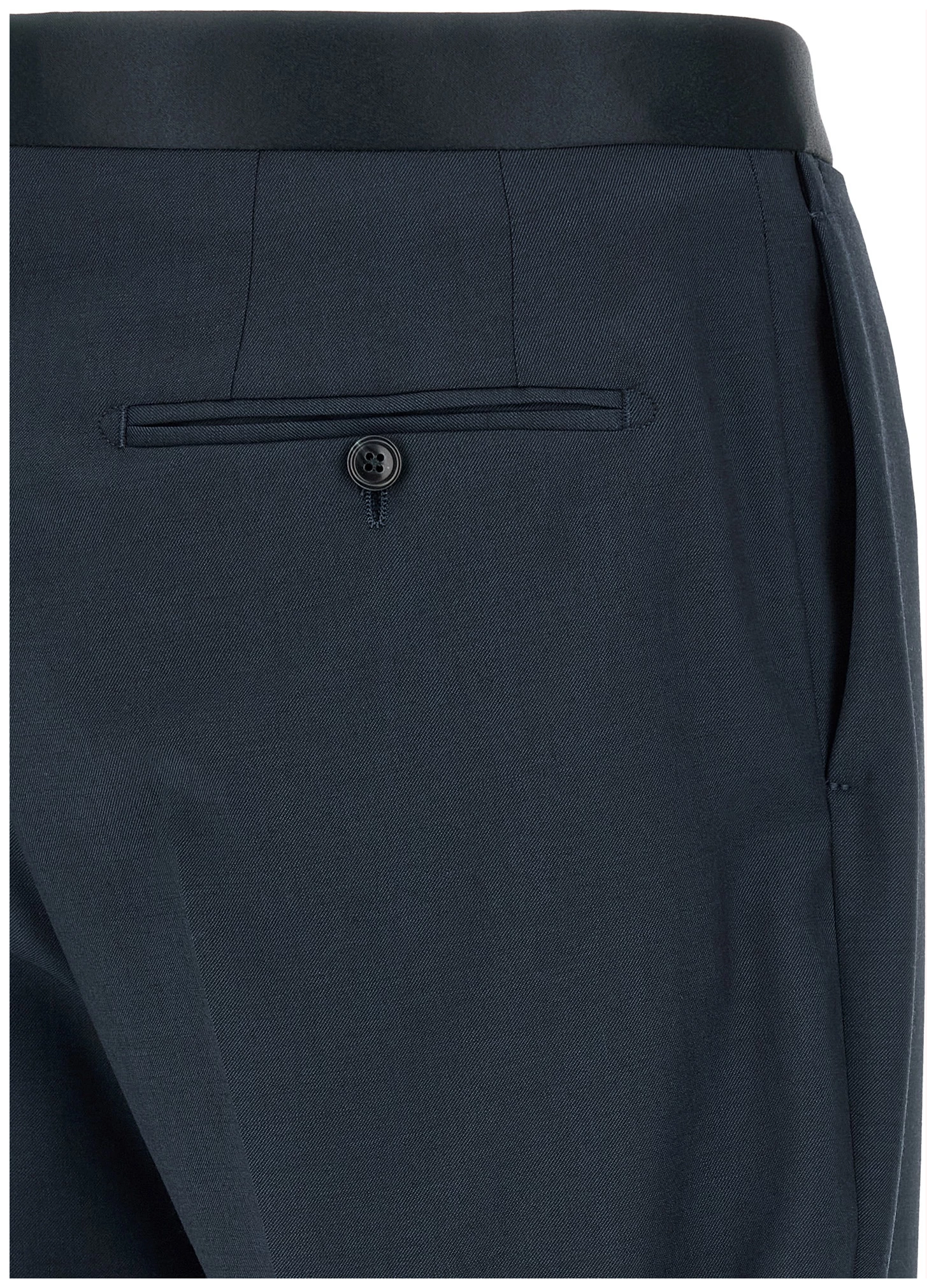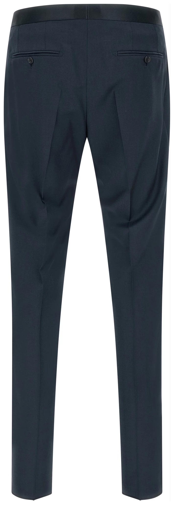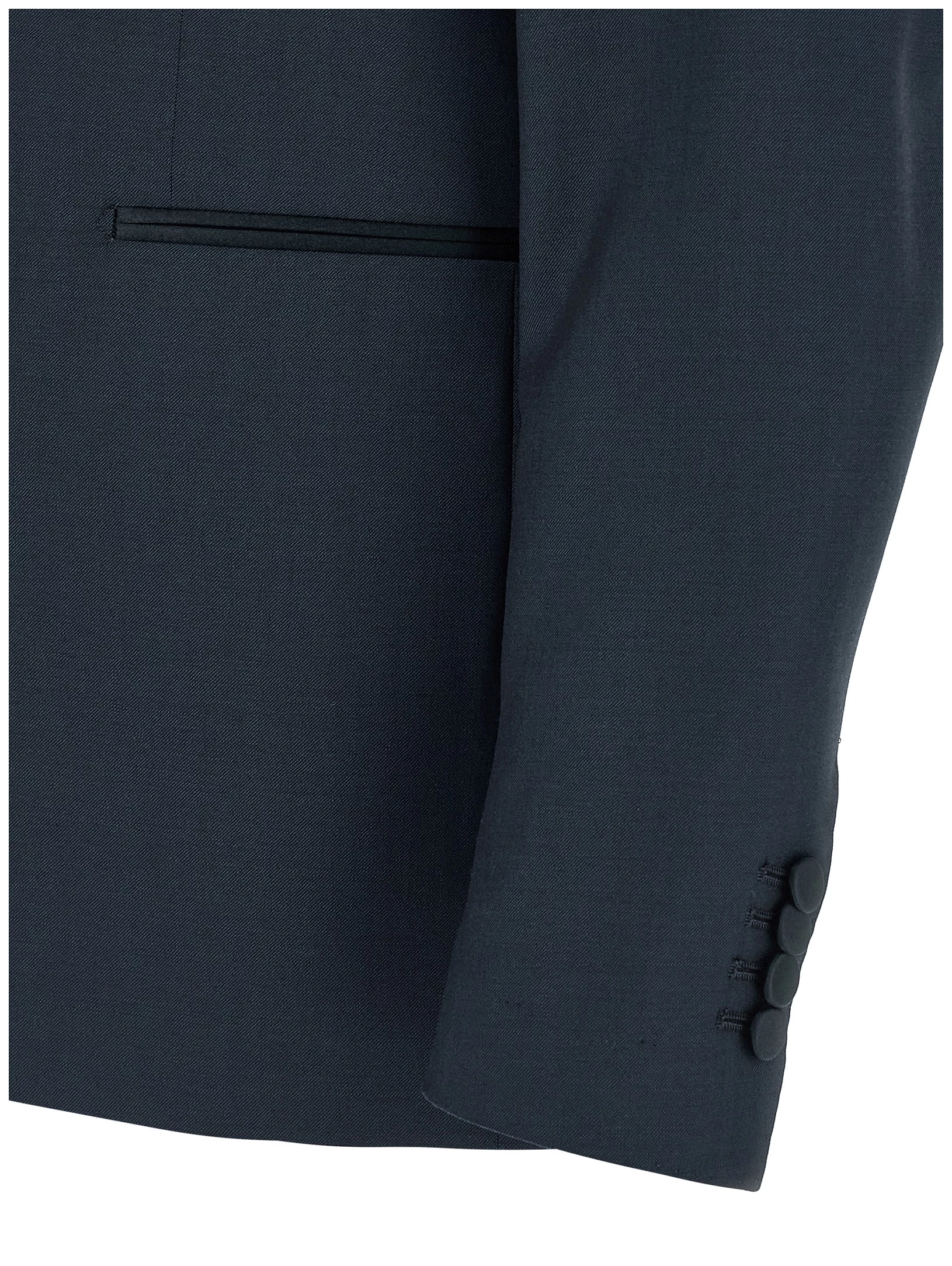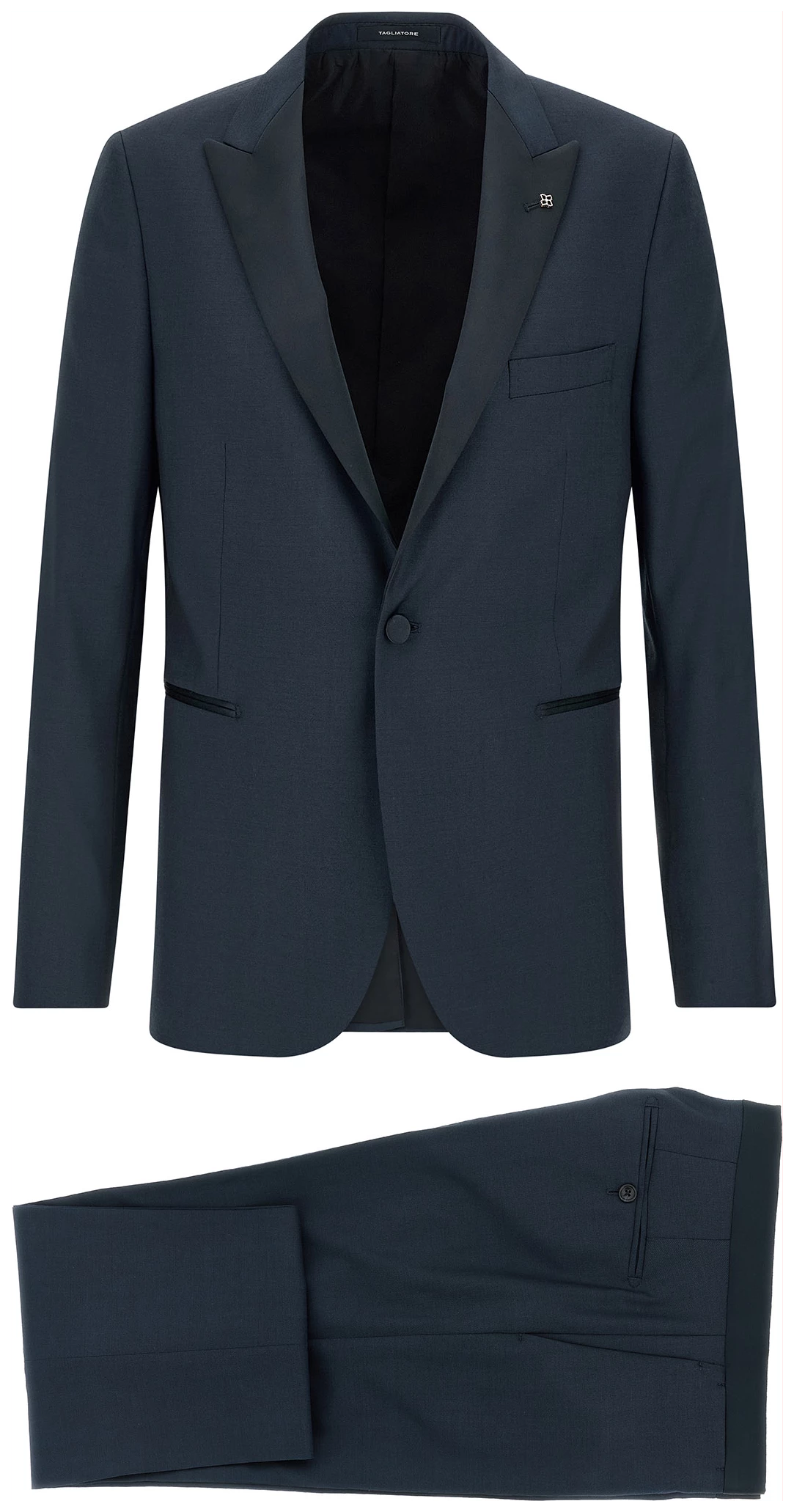 Super 110’s virgin wool dress with tone-on-tone satin details, Tuxedo style consisting of single-breasted blazer with front covered button closure, Peak lapels with removable metal brooch, Breast pocket, Patch pockets, Cupro lining, Four inner pockets, Structured shoulder strap, Cuffs with opening buttonholes, Back vent and trousers with stretched pleat, Straight leg. Front pockets, Back welt pockets, Zip hook and front button closure, Leg bottoms with hem to be finished, Cotton lining.