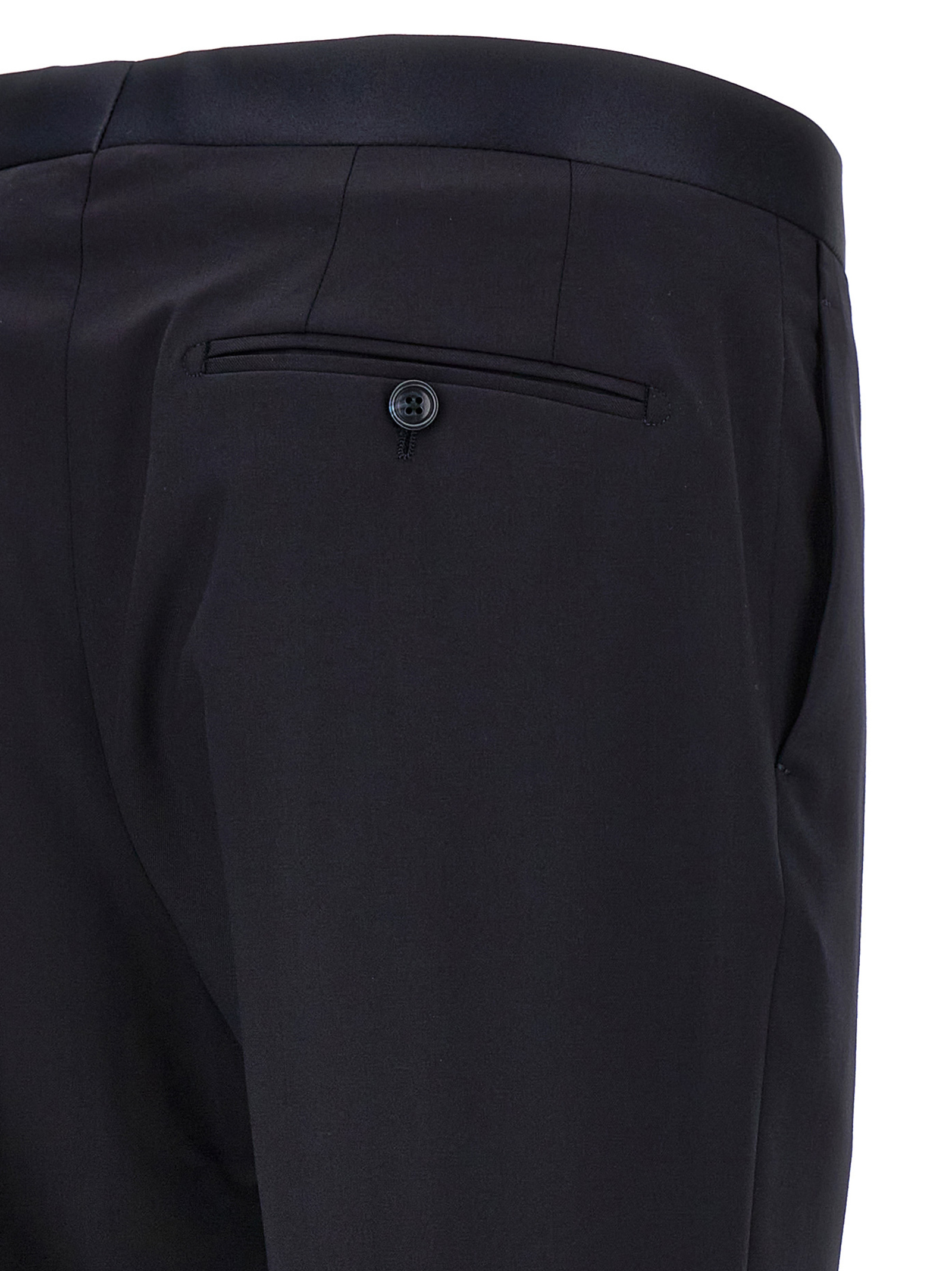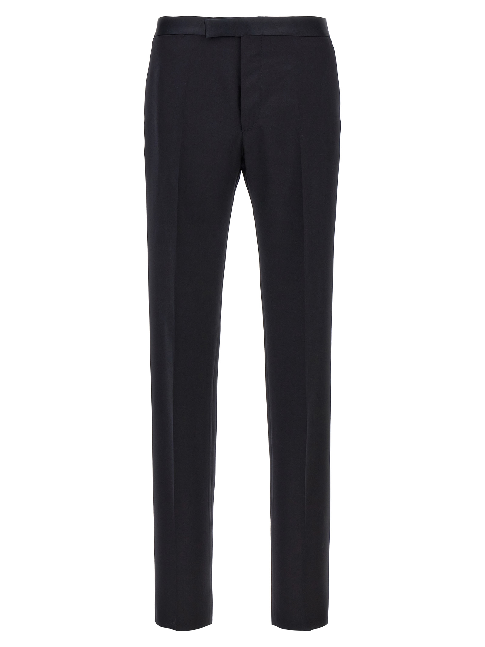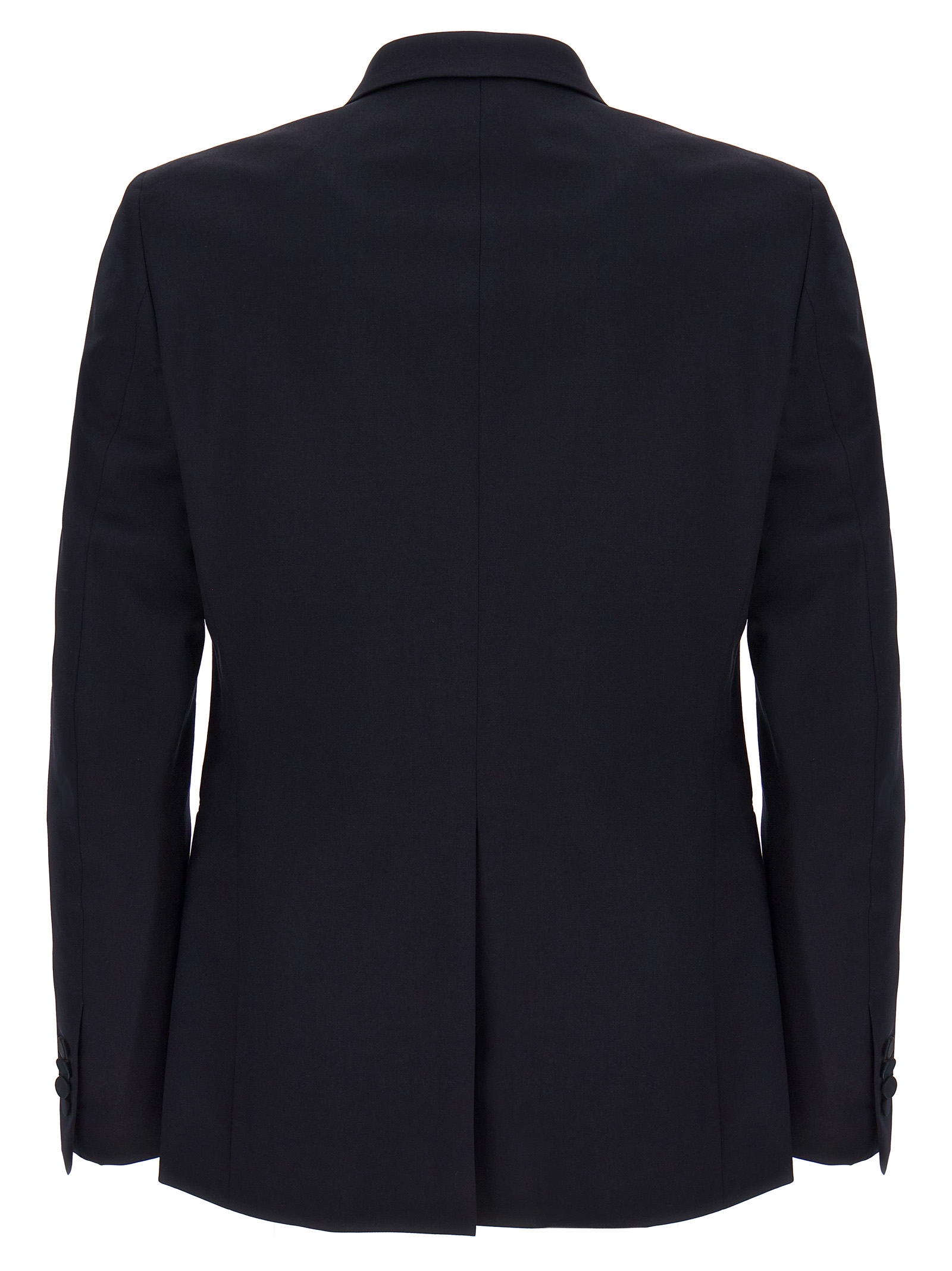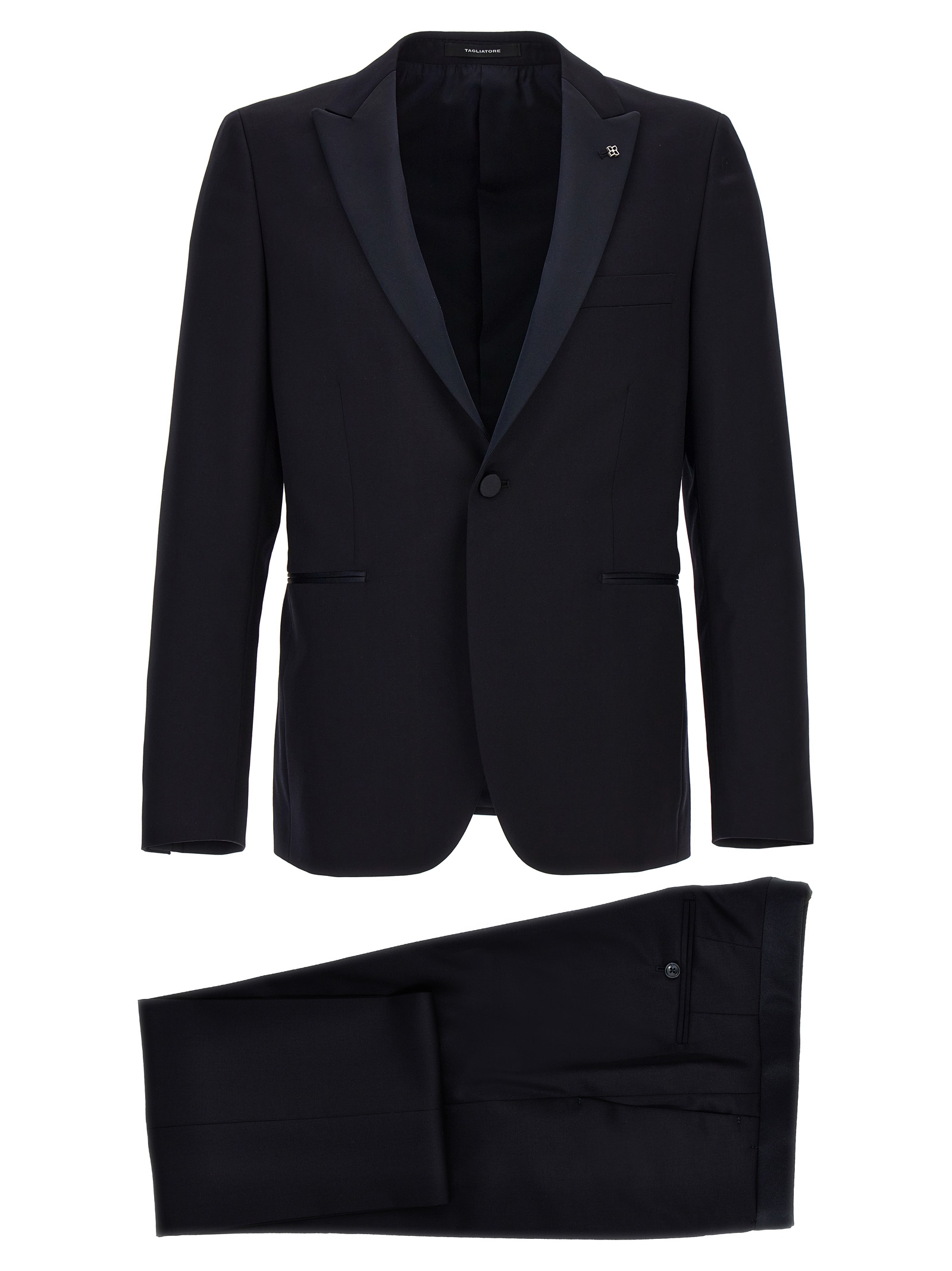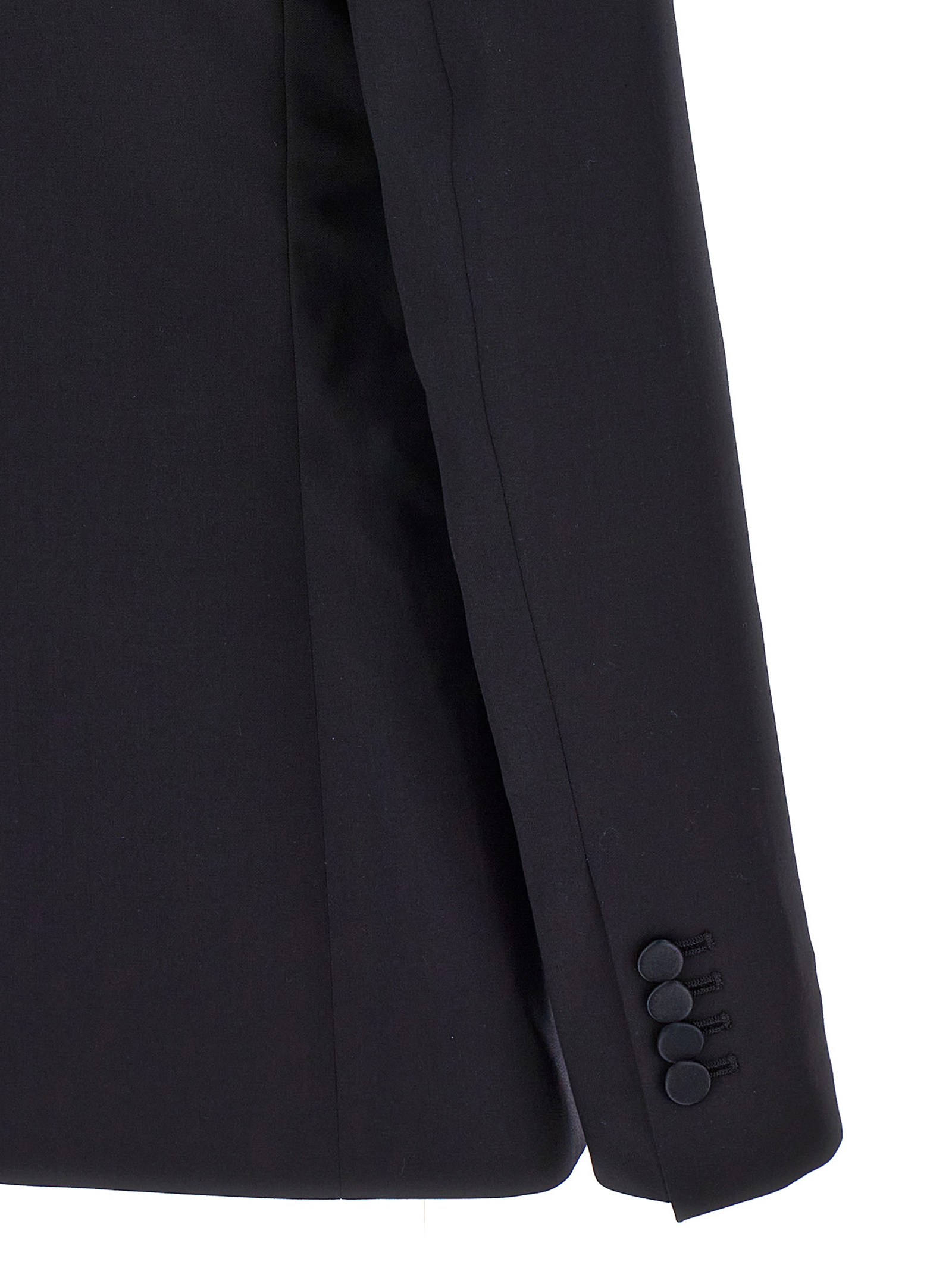 Super 110’s wool tuxedo dress consisting of single-breasted blazer with button closure, pockets, back split and trousers with stretched pleat, hook and button zip closure.