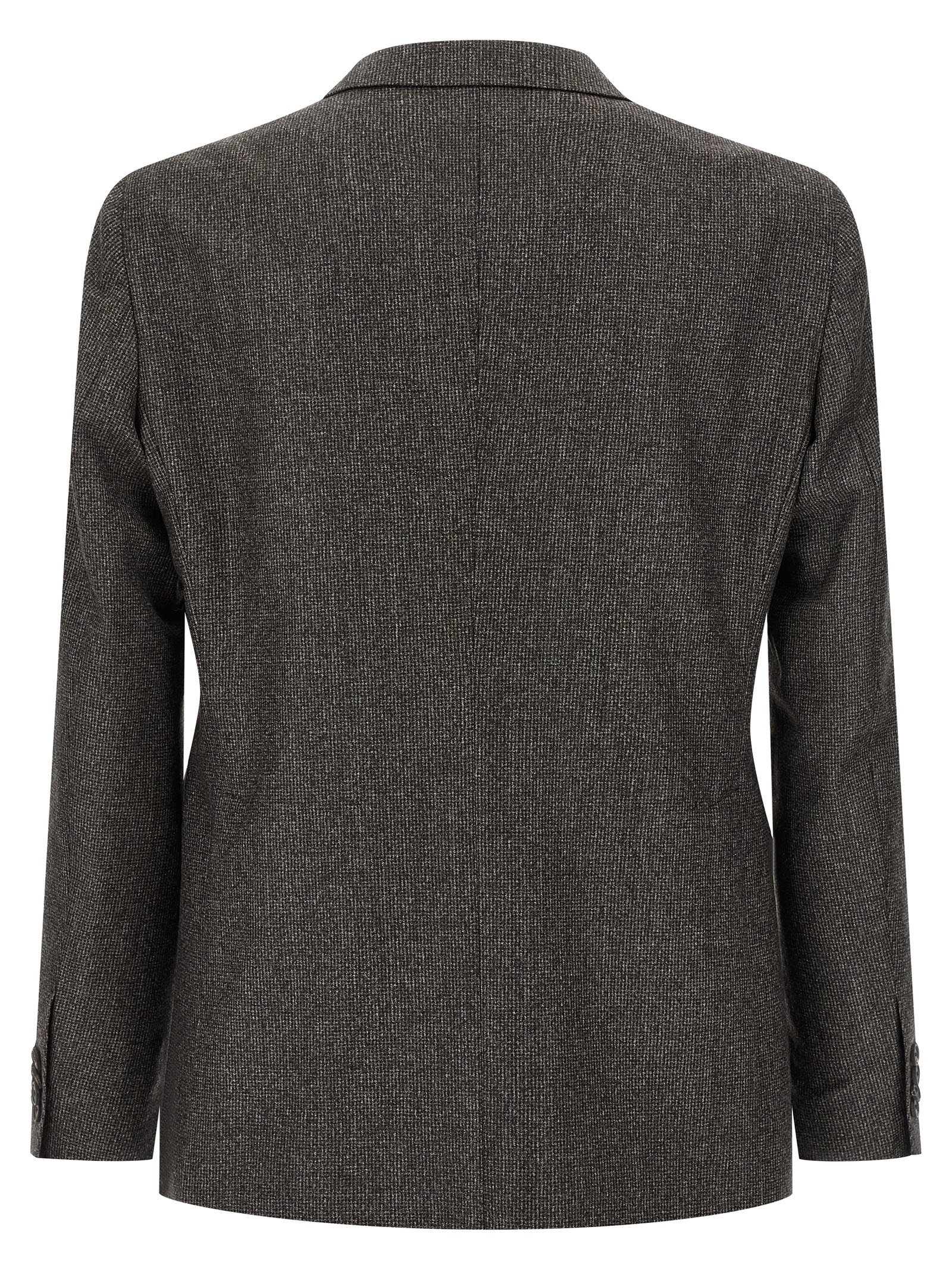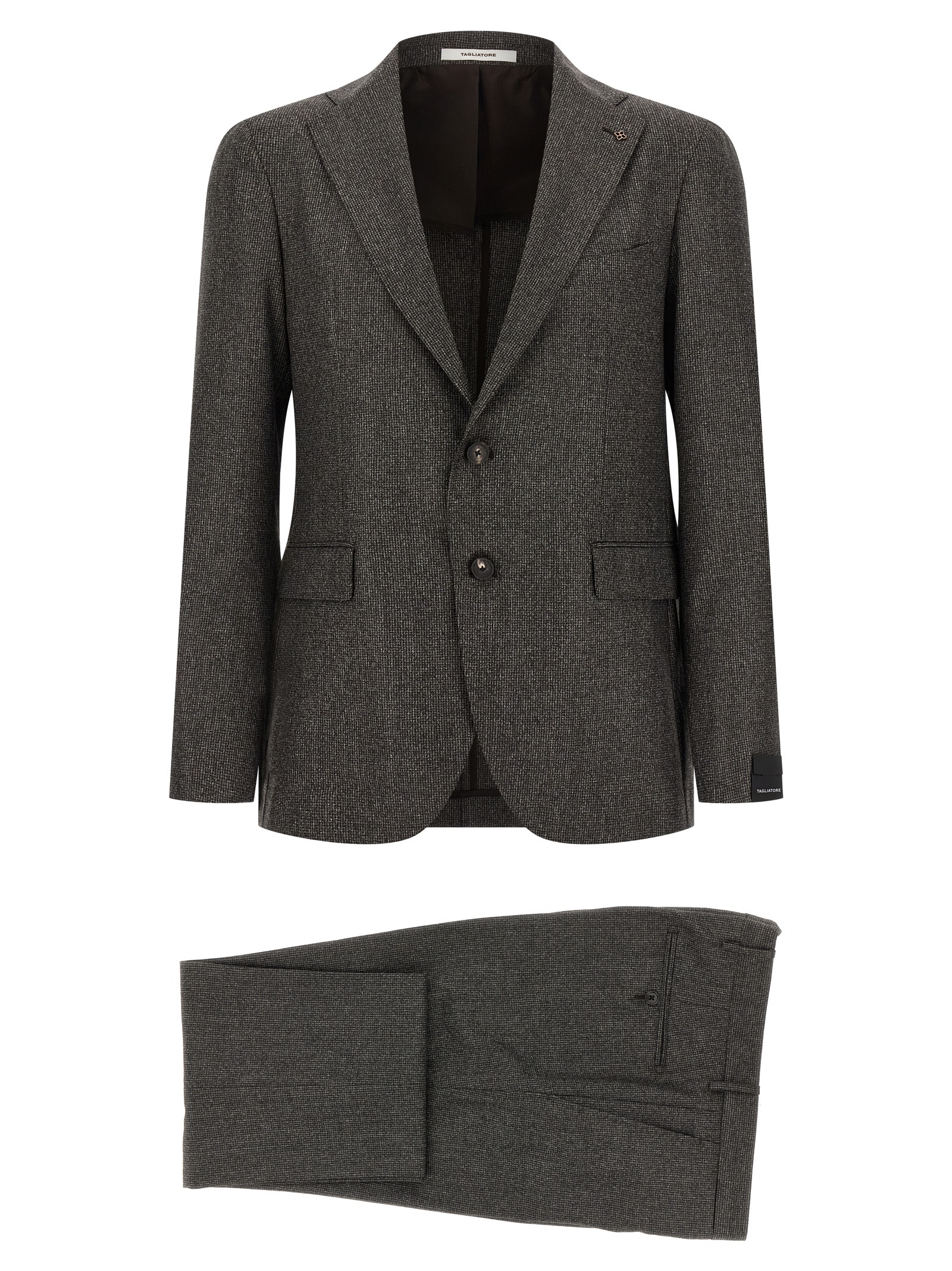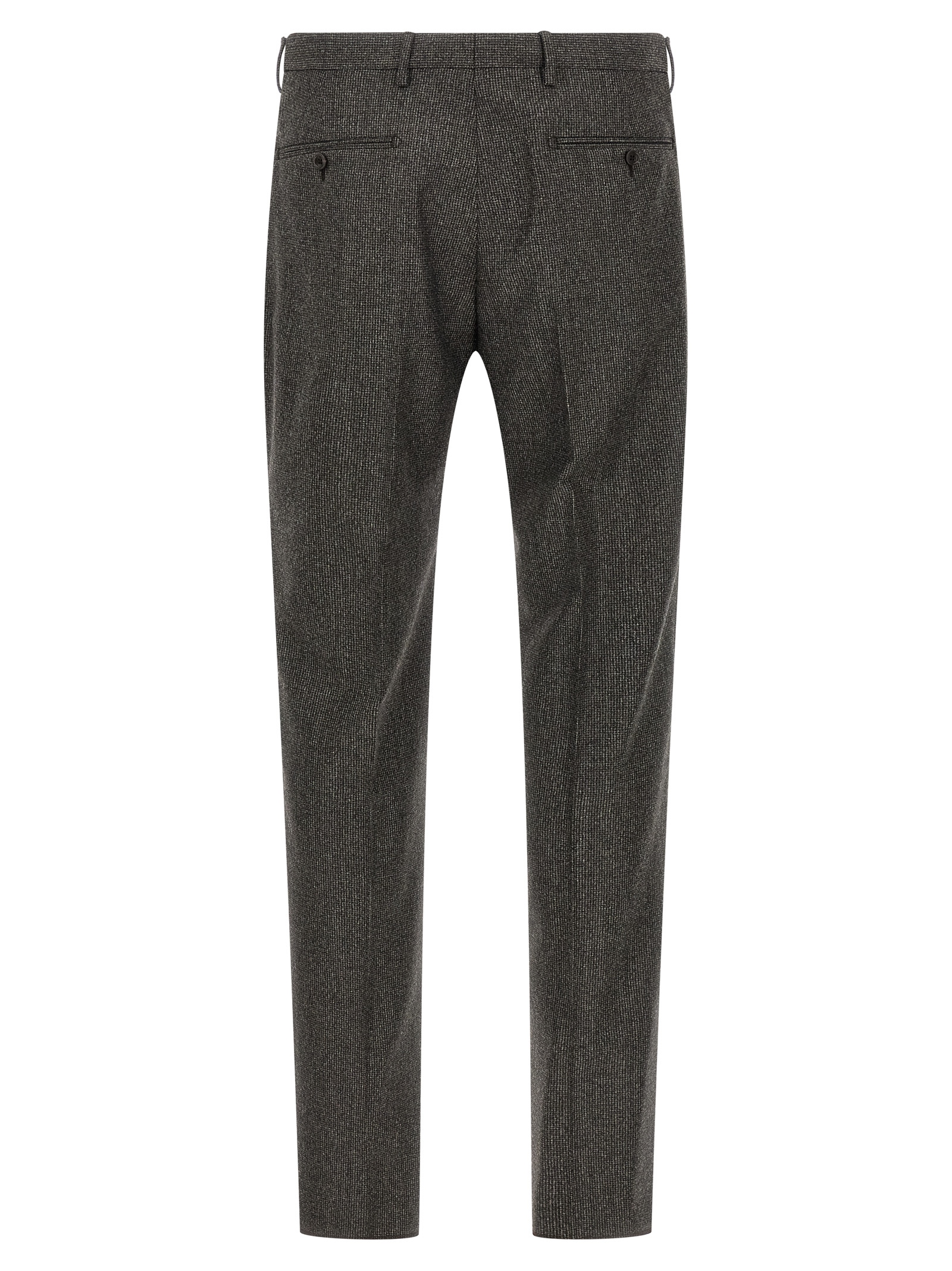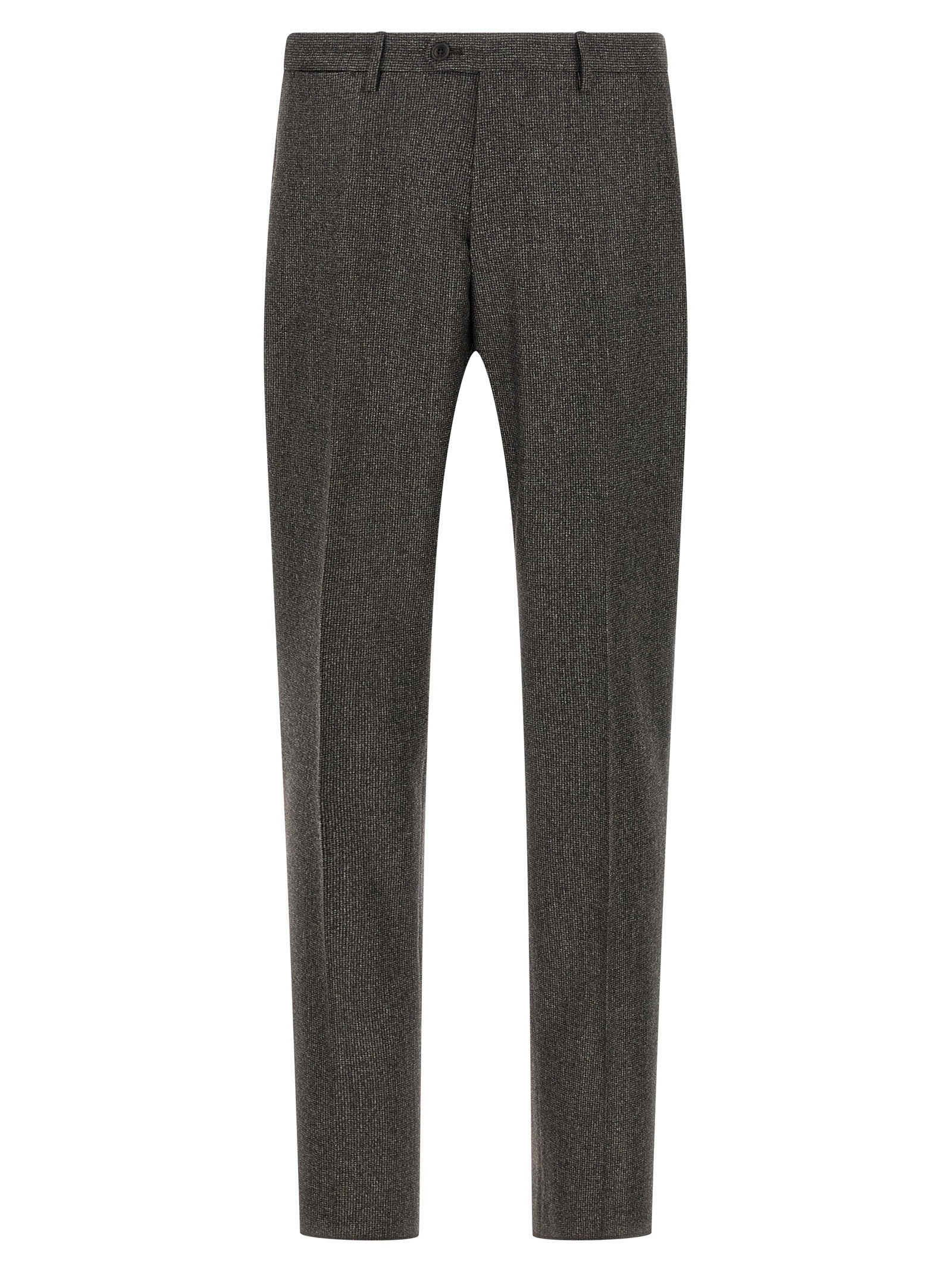 ‘Vesuvio’ super 110’s wool dress with micro houndstooth pattern, consisting of single-breasted blazer with front button closure, mirror lapels with removable brooch, breast pocket, flap pockets, cuffs with open buttonholes, back slits, pants with zip and button closure, pockets, stretched pleat.