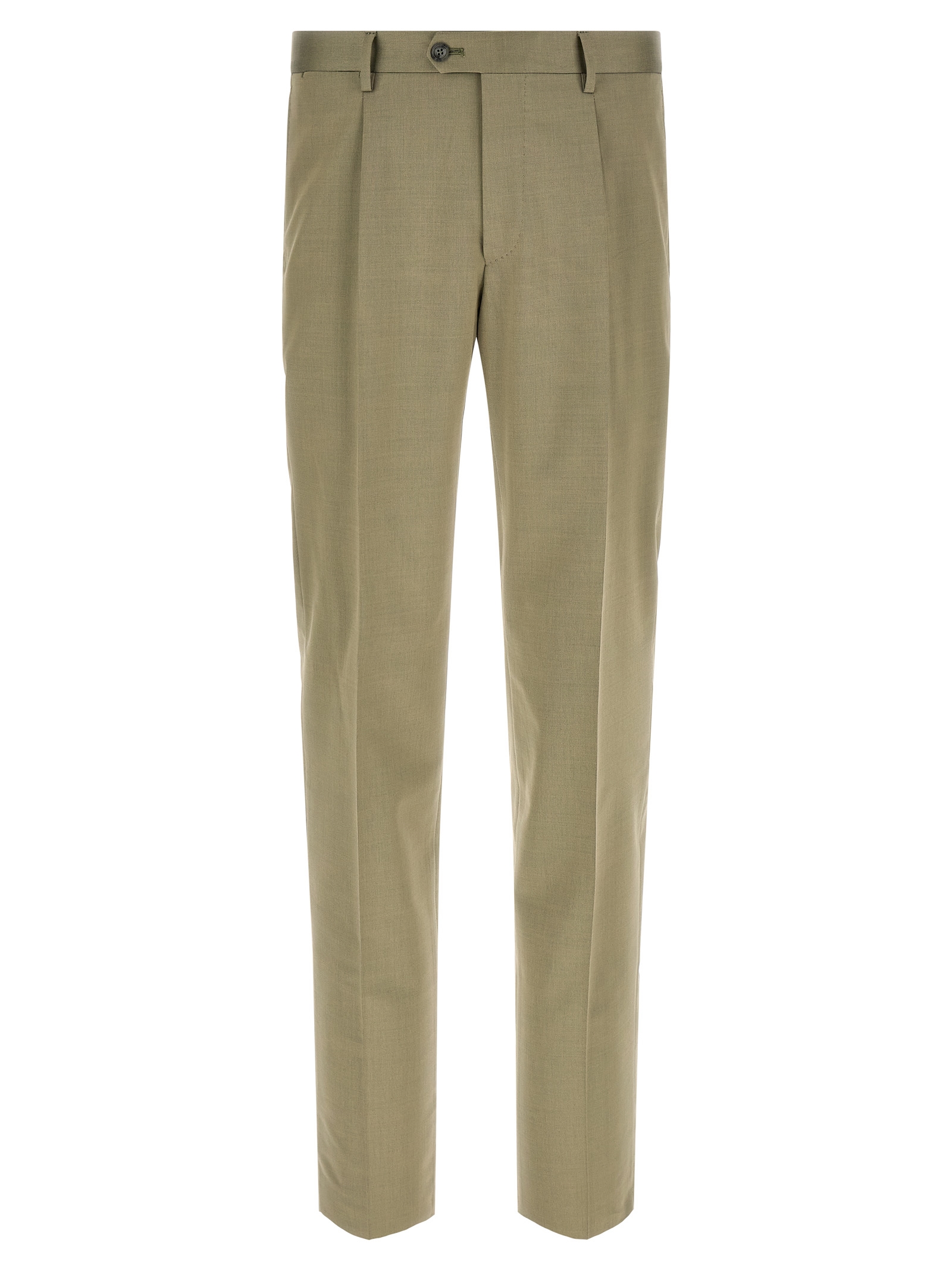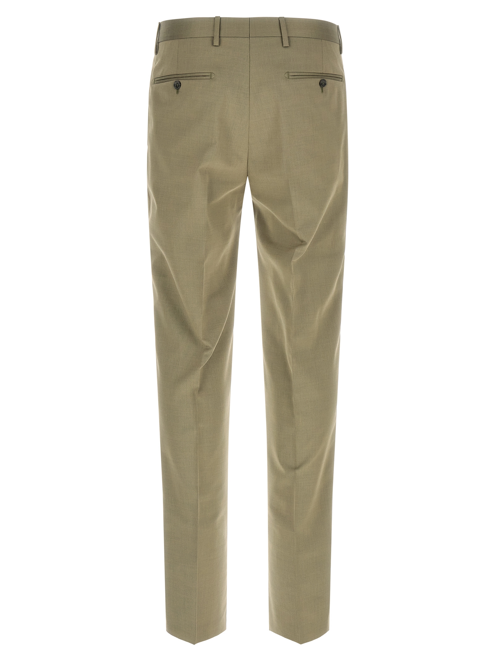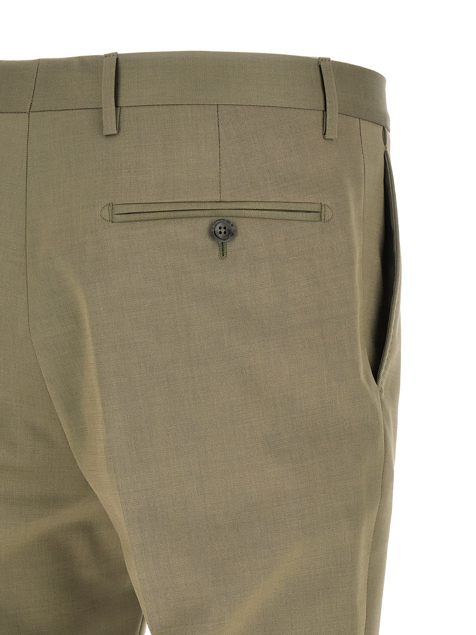 ‘Vesuvio’ virgin wool and cotton blend dress consisting of single-breasted blazer with front button closure, peak lapels with removable metal brooch, breast pocket, flap pockets, cupro lining, two inner pockets, cuffs with open buttonholes, back slits and trousers with stretched pleat, front ‘americane pockets’, back welt pockets, front zip and button closure, cotton lining.