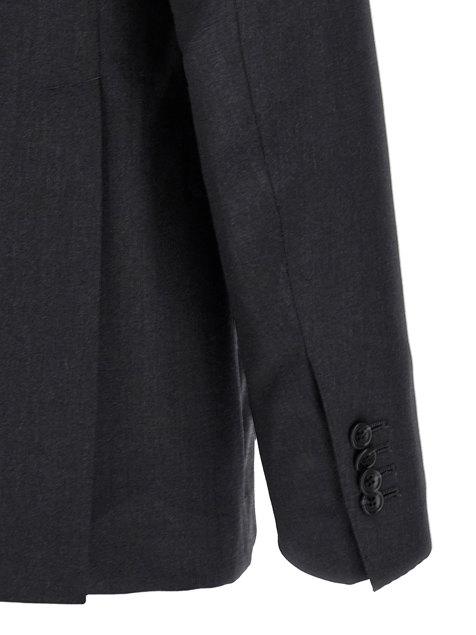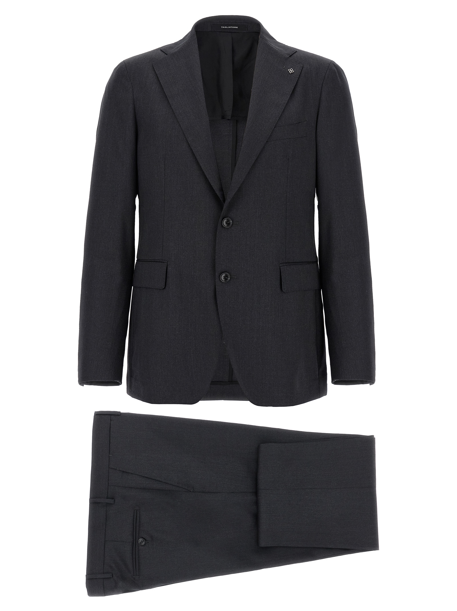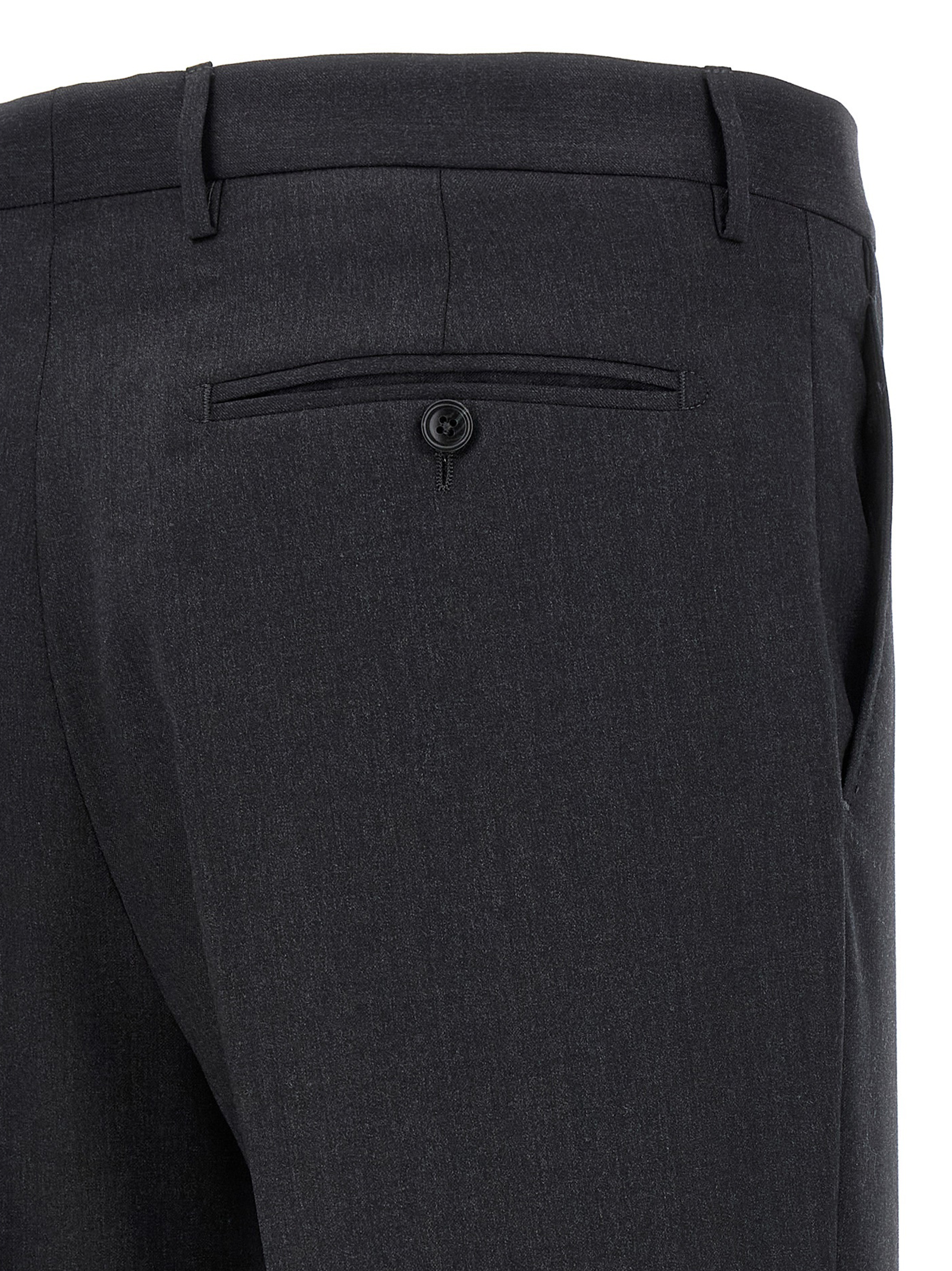 Melange virgin wool Vesuvio dress consisting of single-breasted deconstructed blazer with front button closure, mirror lapels with removable metal brooch, half lining, breast pocket, flap pockets, buttonhole cuffs, back slits and regular flat front pants, stretched pleat, front ‘americane pockets’, back welt pockets, zip closure and front buttons.