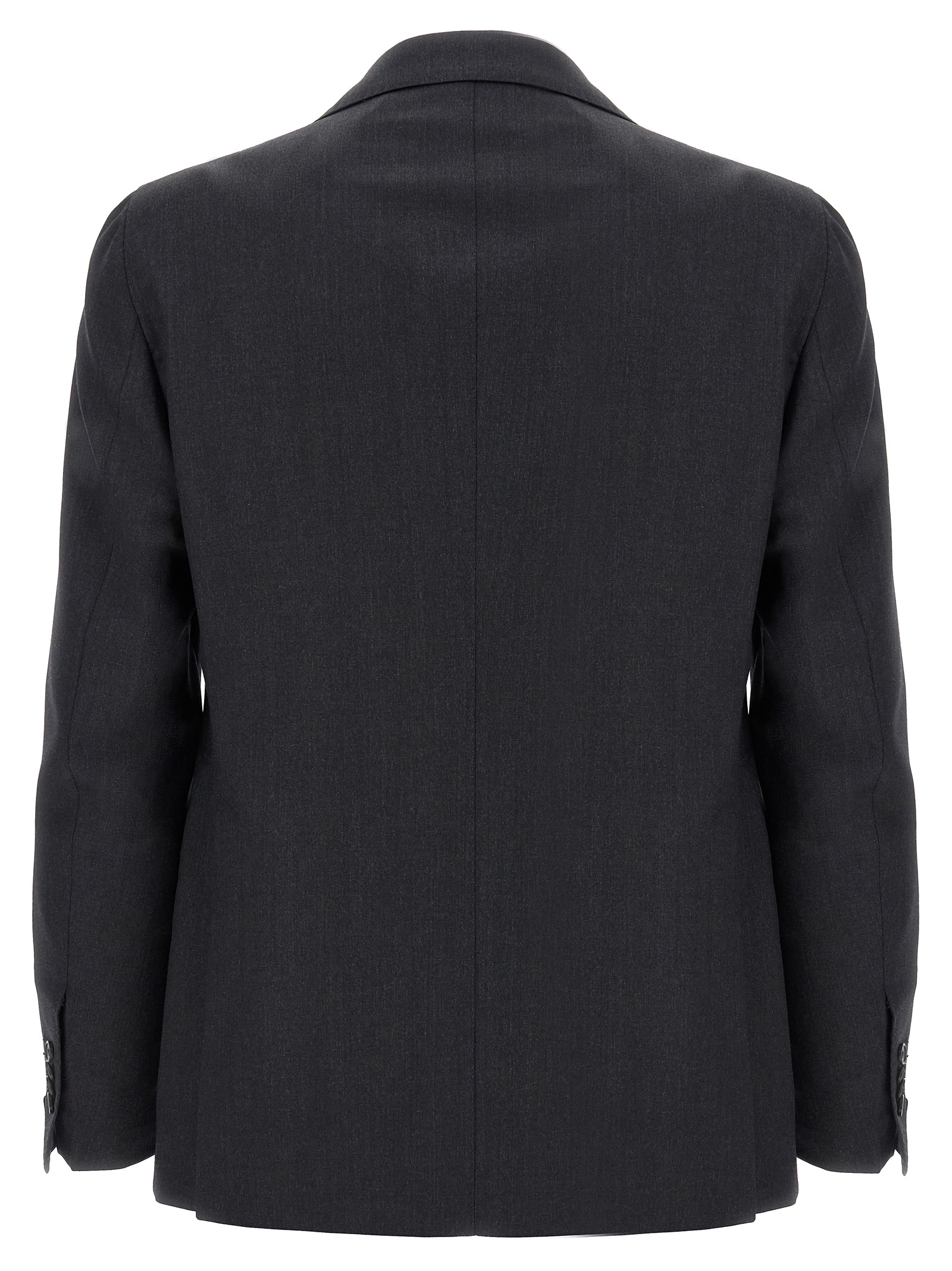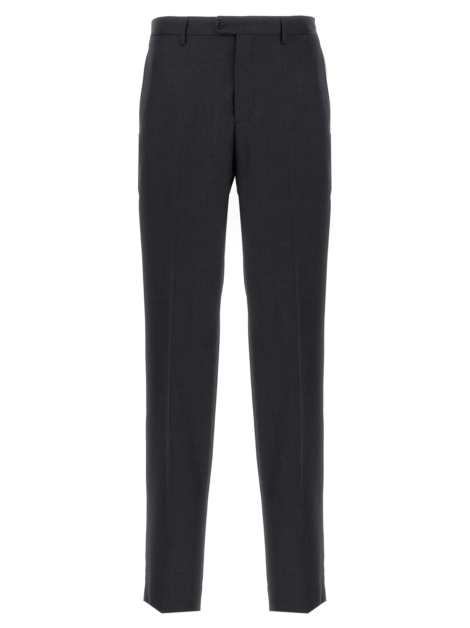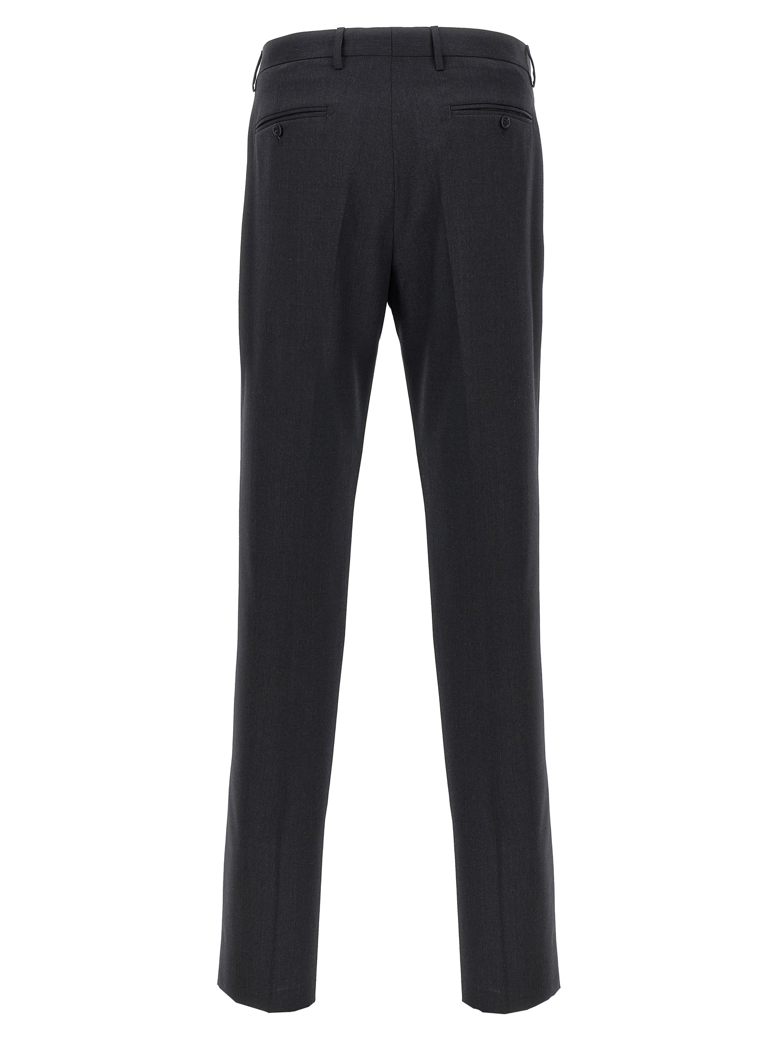 Melange virgin wool Vesuvio dress consisting of single-breasted deconstructed blazer with front button closure, mirror lapels with removable metal brooch, half lining, breast pocket, flap pockets, buttonhole cuffs, back slits and regular flat front pants, stretched pleat, front ‘americane pockets’, back welt pockets, zip closure and front buttons.