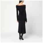 Midi dress by The Andamane in black viscose jersey, characterized by a design with off-the-shoulder sleeves, draping on the side, long sleeves, and a fitted silhouette.