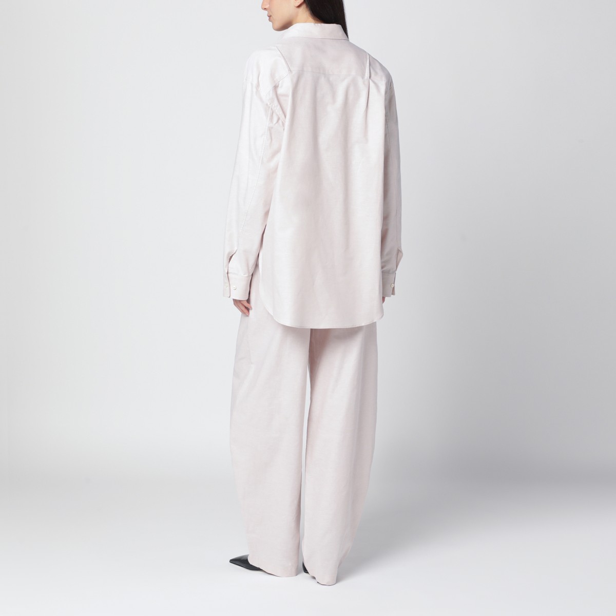 Complete oversized two-piece set by The Andamane in ivory mélange, consisting of a shirt with a pointed collar, front buttoning, and an applied chest pocket, and wide pants with a drawstring at the waist and two side pockets.