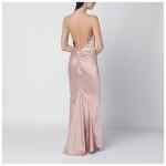 Peony-coloured satin long dress by The Andamane, featuring thin straps, open back, back draping, and rear zip closure.
