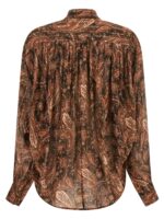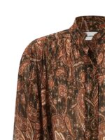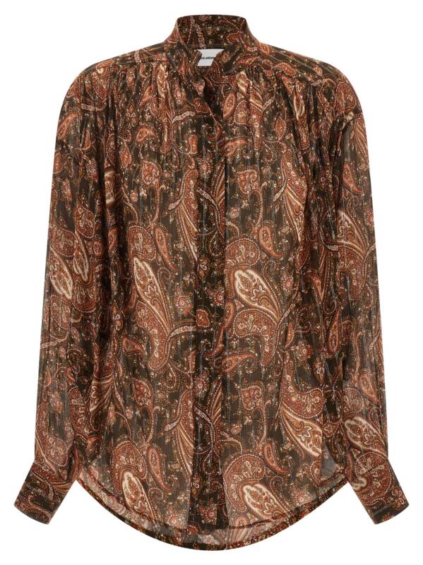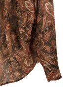 ‘rania’ shirt in light fabric with paisley pattern print and lamé thread insert, Mandarin collar, Front closure with concealed buttons, Gathered shoulder and wide sleeves, Long with cuffs and buttons. Size and Fit – Oversized fit
