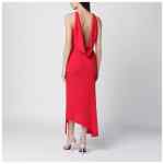 Scarlet red sleeveless midi dress by The Andamane in crêpe, featuring an asymmetric hem, fluid line, and open back with hood-style detail at the base.