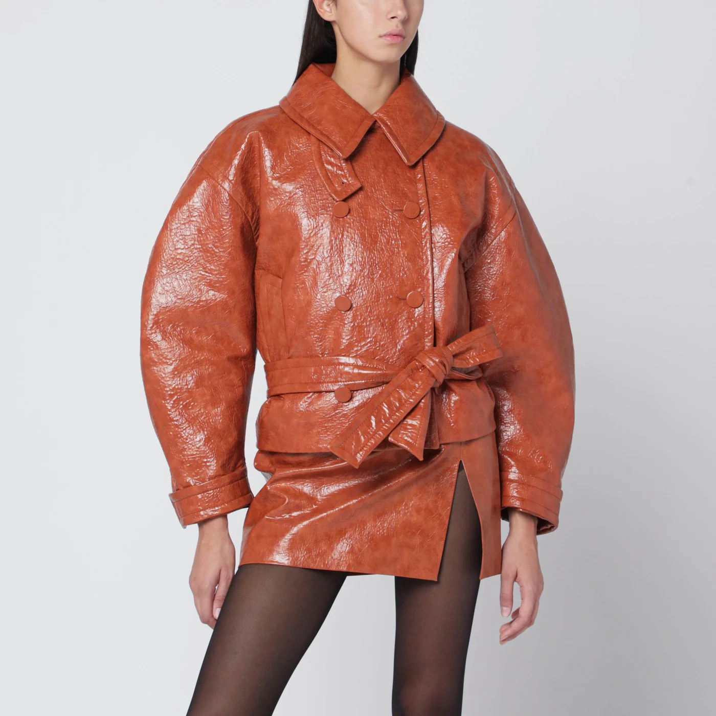 The Andamane jacket in faux leather in a leather colour characterized by a double-breasted front buttoning adjustable waist belt two side pockets wide long sleeves and a collar with a strap detail with buttons. Size and Fit – Model wears size 40 IT Model measurements: Height: 178 cm Chest: 83 cm Waist: 63 cm Hips: 91 cm