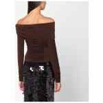 Top of The Andaman in brown jersey, characterized by off-the-shoulder design, draping on the side, long sleeves, and a fitted silhouette.