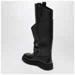 Boot by The Attico in black leather, featuring square toe, double-shaft design with one draped lower shaft, embossed side logo detail, tone-on-tone heel logo lettering, and leather sole.