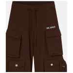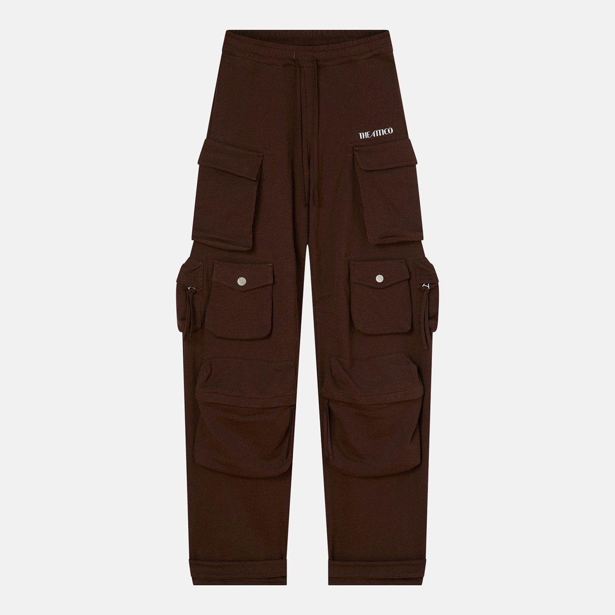 Brown cotton pants by The Attico, characterized by wide legs, numerous cargo pockets, an elasticized waistband with drawstring, two side welt pockets, and logo lettering on the front.
