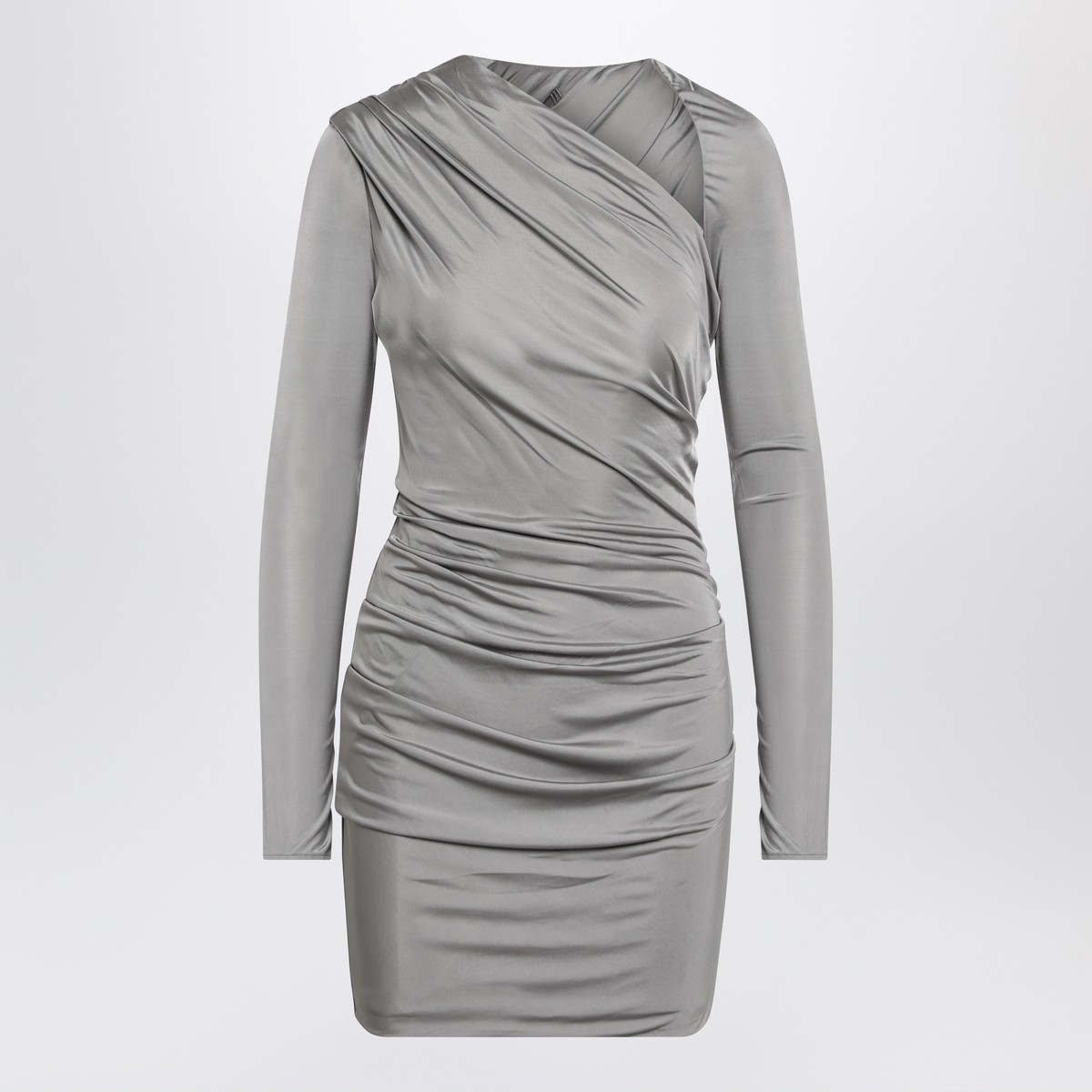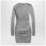 Mini dress by The Attico in grey viscose, characterized by draped design, long sleeve, and asymmetric neckline.