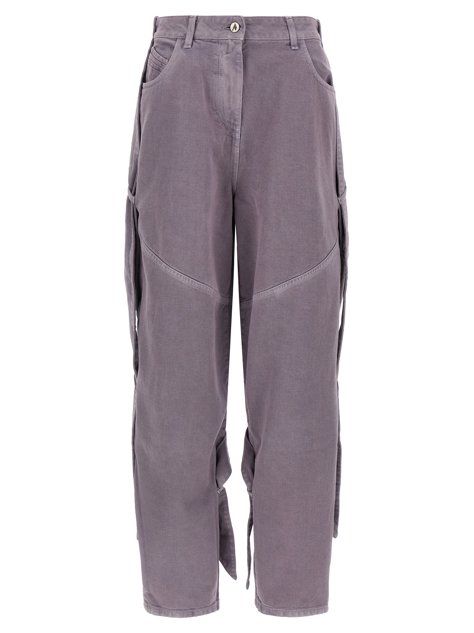 Garment-dyed cotton denim jeans, wide tapered leg, low crotch, front zip and button closure, five pockets, matching side ribbons to modulate as desired, back leather logo tag.