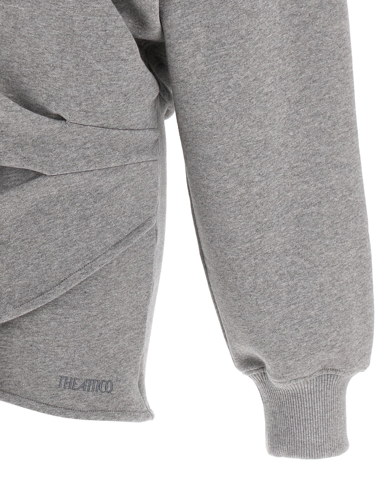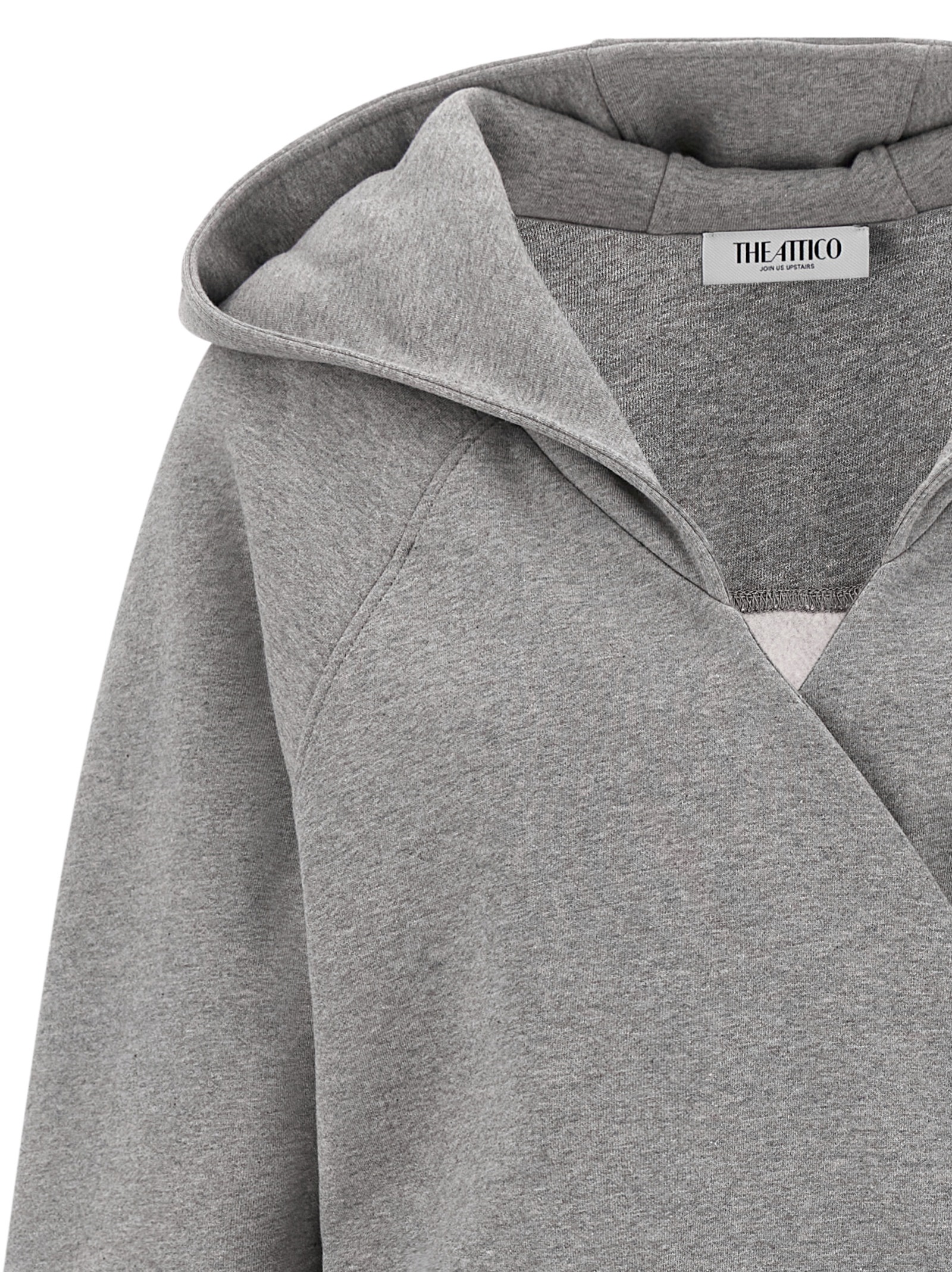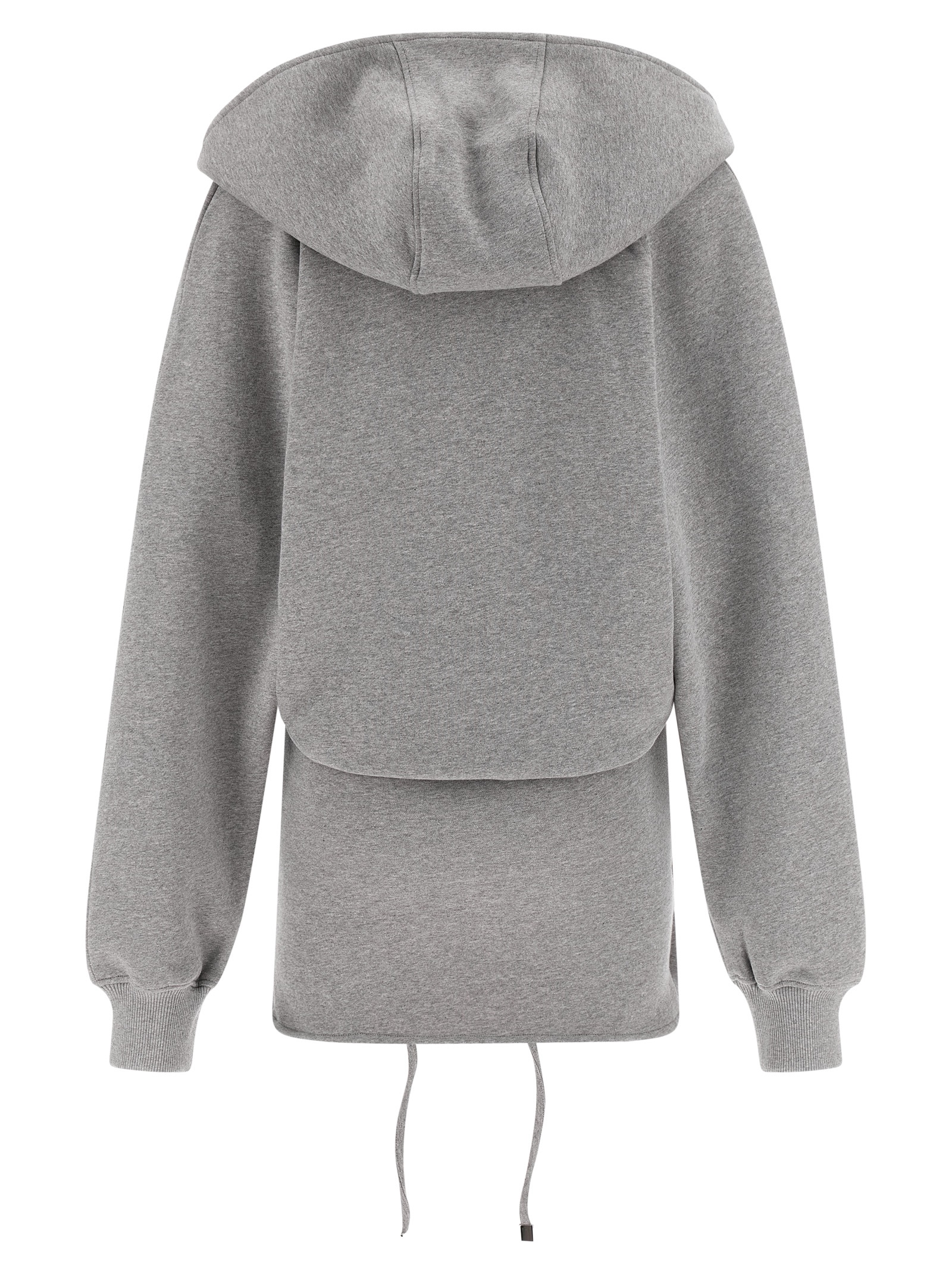 American mélange fleece hooded mini dress with wallet style with wide v-neck, Tone-on-tone logo embroidery on the front, Drawstring at the waist, Long wide sleeves with cuffs.
