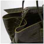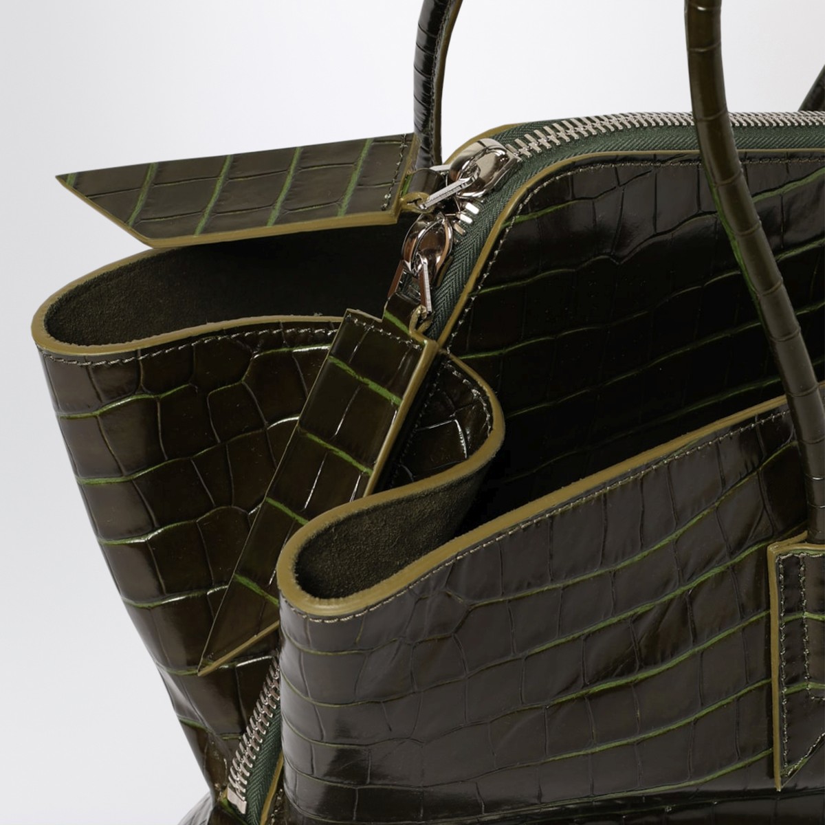 The Attico medium bag in dark green crocodile-embossed leather, featuring two long tubular handles, two open compartments, one compartment with double zip closure, one internal flat pocket, asymmetric design, metal feet, embossed lettering logo on the front, and silver-tone metal hardware.