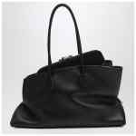 Black calfskin bag from The Attico in medium size, featuring two long tubular handles, two open compartments, one compartment with double zip fastening, one interior flat pocket, asymmetrical design, metal feet, embossed lettering logo on the front and silver-coloured metal hardware.