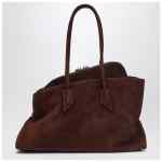 Medium sized chocolate-coloured brushed suede bag from The Attico featuring two long tubular handles, two open compartments, one compartment with double zip closure, one interior flat pocket, asymmetric design, metal feet, embossed lettering logo on front and silver-tone metal hardware.