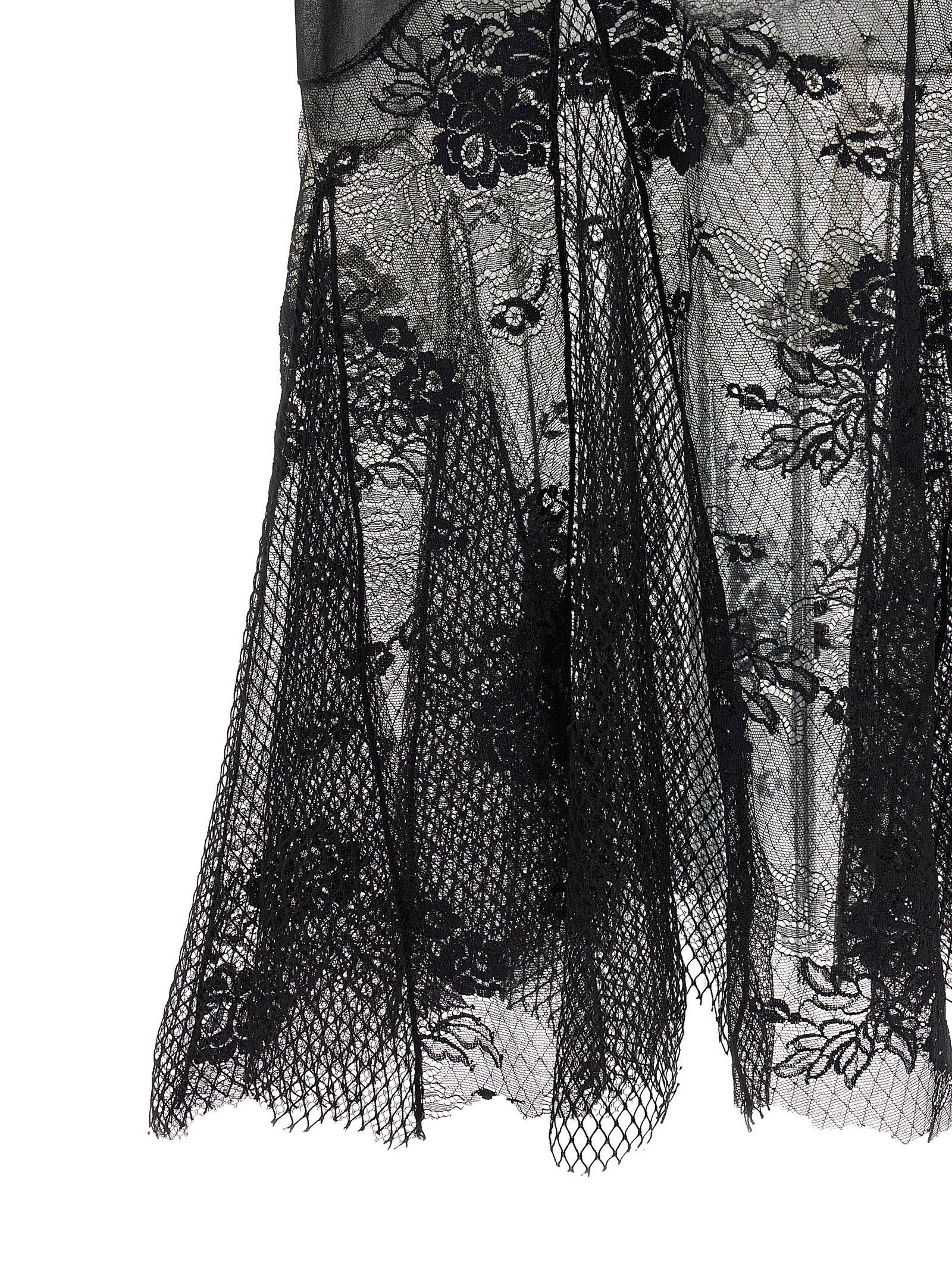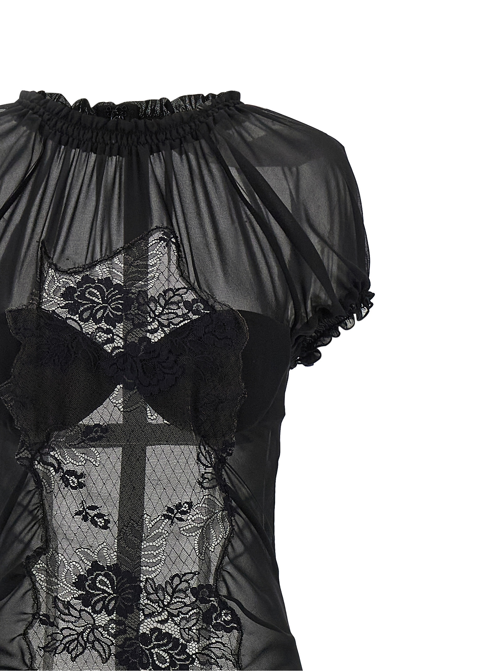 Tulle midi dress with tone-on-tone lace inserts i don’t see, Elastic high neck with ruffles, Integrated bandeau bra with back hook closure, Short raglan sleeves with elastic cuffs and ruffles, Flared flounce with raw cut hem on the hem.