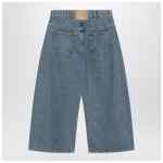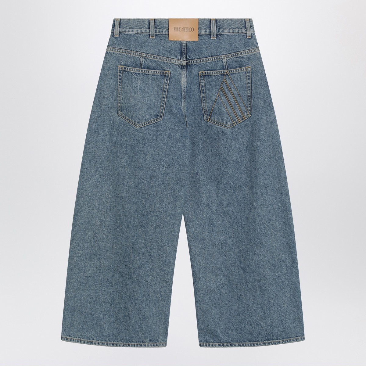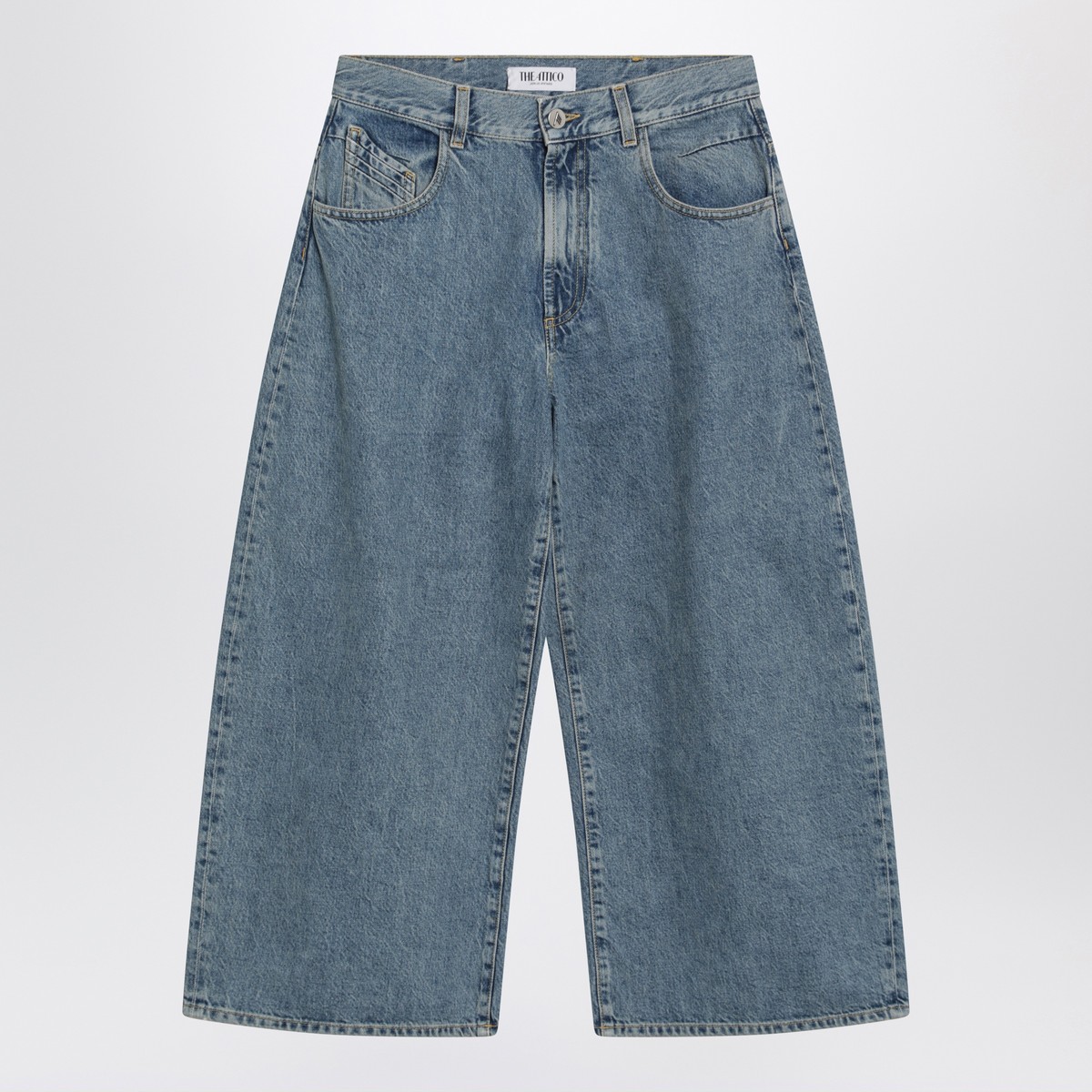 Light blue cotton denim cropped jeans by The Attico, featuring front zip and branded button, belt loops, five classic pockets with logo stitching, and central back logo patch.