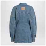 Shirt-dress mini by The Attico in light blue cotton denim, featuring front button closure, wide long sleeves, buttoned cuffs, dropped shoulders, contrast stitching, two front flap pockets with buttons, back logo patch, and fitted waist.