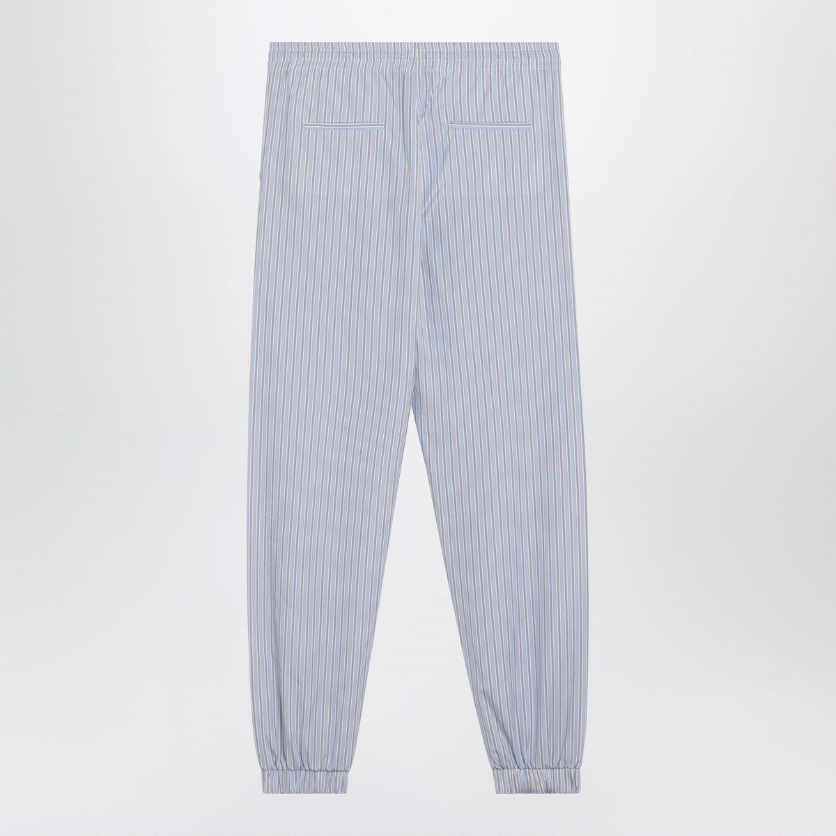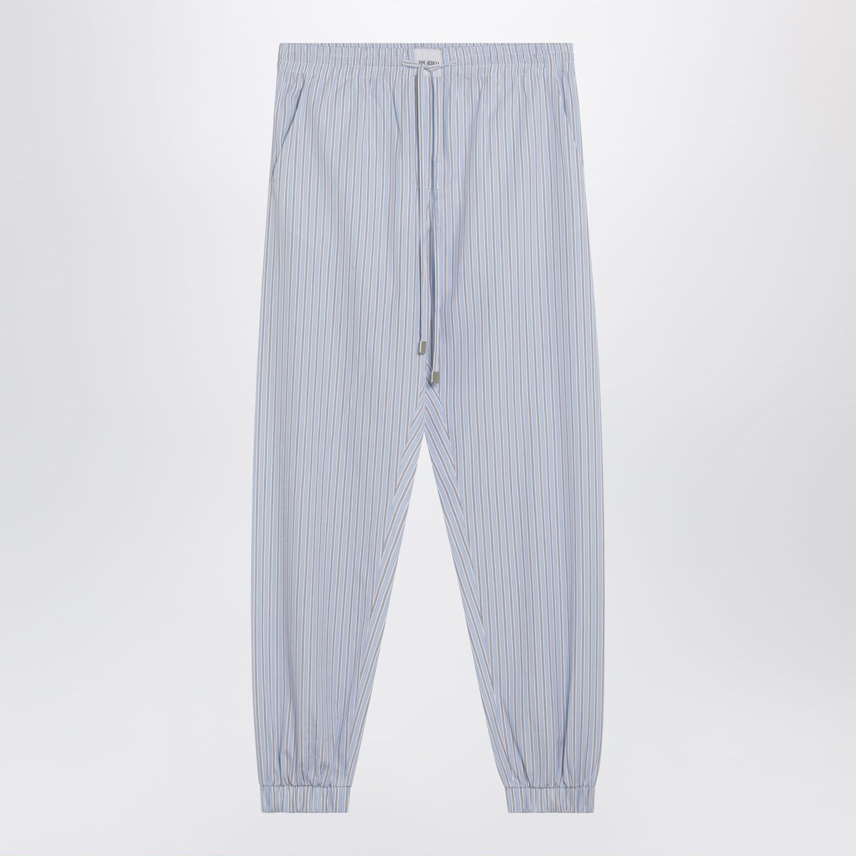 The Attico light blue/white striped cotton poplin trousers featuring elasticated drawstring waist, front logo label, side pockets, back welt pockets and elasticated hems.